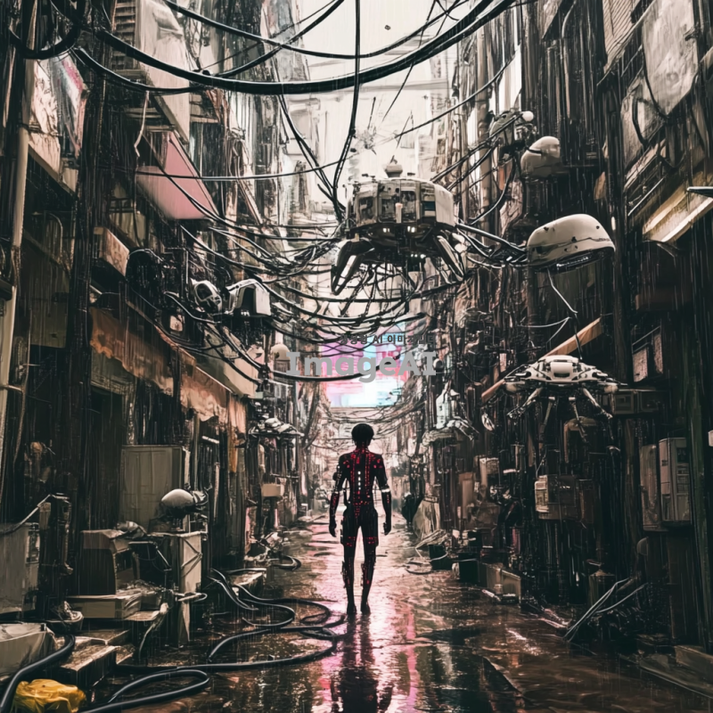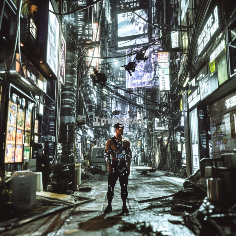 어두운 도시의 미래적 풍경, 네온 불빛이 반짝이는 골목길, 사이버네틱 장치가 장착된 한국인 남성이 홀로 서 있는 모습, 그의 눈은 빛나는 디지털 스크린으로 가득 차 있으며, 복잡한 기계 장치들이 주변에 흩어져 있는 장면, 공중에는 드론들이 날아다니고, 배경에는 거대한 스크린에 광고가 빛나고 있는 모습.
