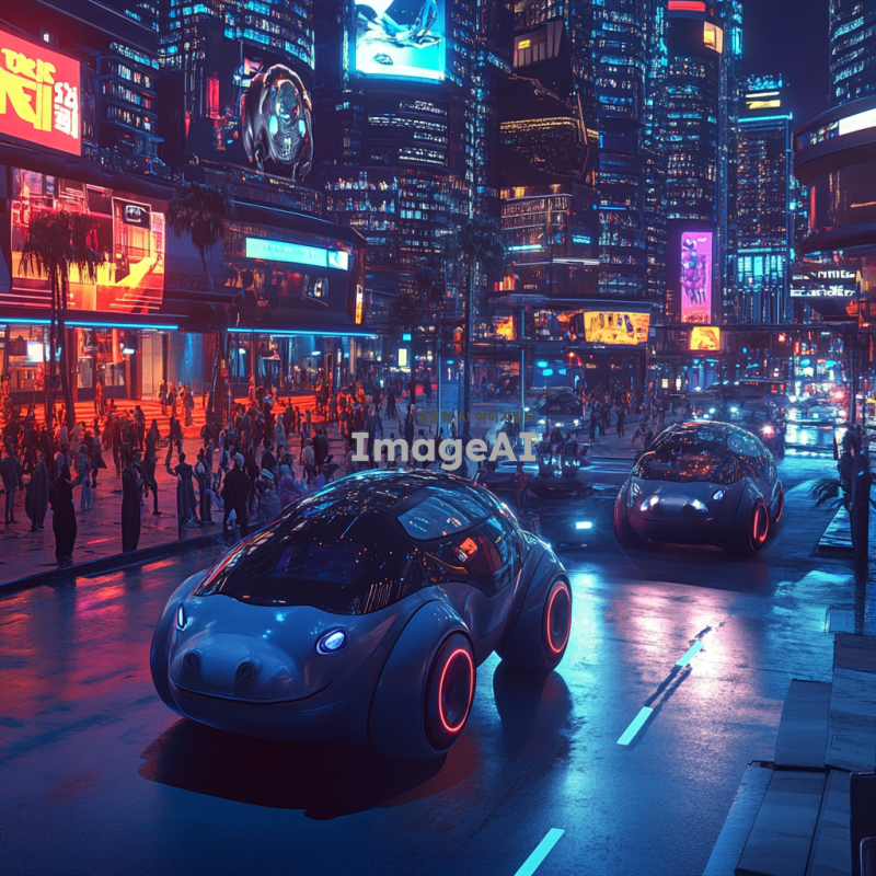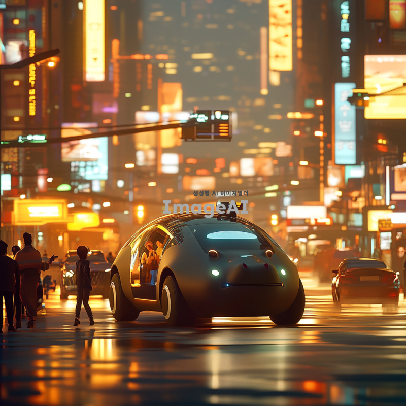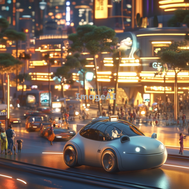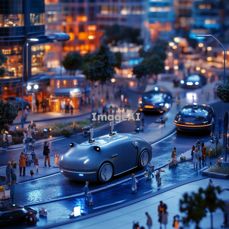 미래의 도심에서 자율주행자동차가 도로를 주행하는 모습, 세련된 초원 배경, 다양한 사람들과 하마들과 차량들이 어우러진 활기찬 거리 풍경, 자연광이 비추는 따뜻한 분위기, 세련된 하마모양 디자인의 자율주행차가 부드럽게 이동하는 장면.