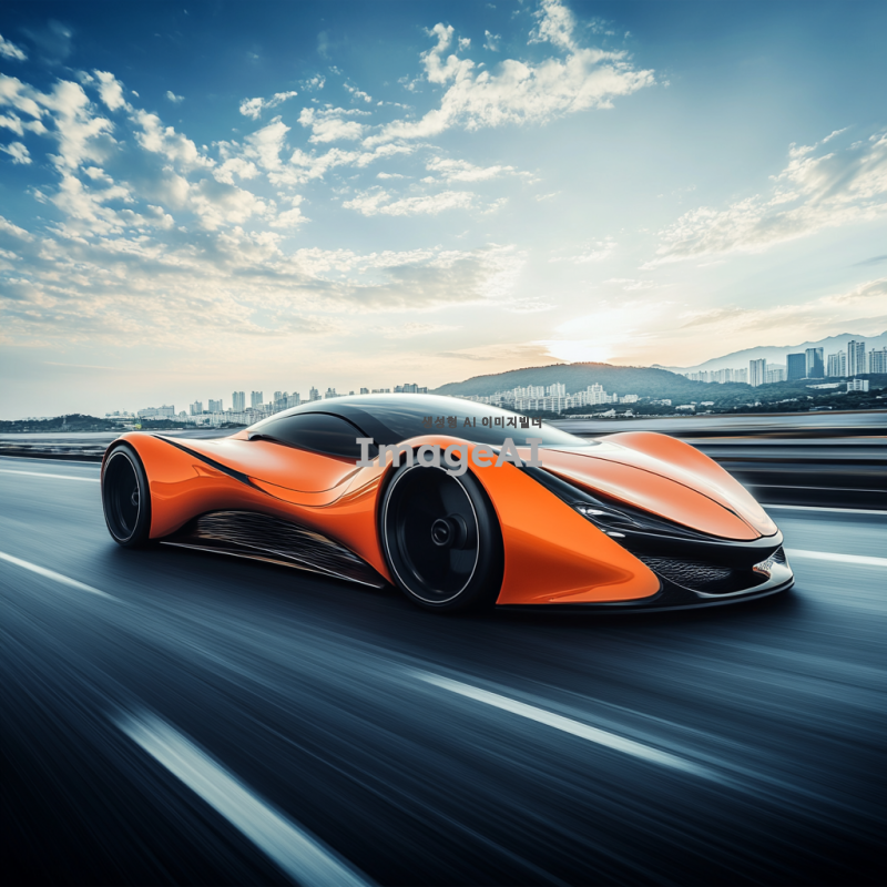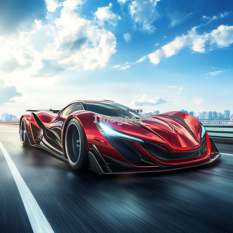 한국의 도로를 질주하는 현대적인 스포츠카, 날카로운 디자인과 유려한 라인이 강조된 모습, 배경에는 푸른 하늘과 함께 도시 풍경이 펼쳐져 있는 장면, 속도감과 역동성을 느낄 수 있는 구도.