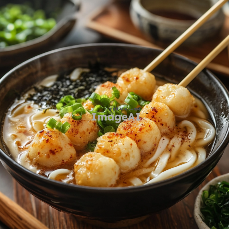 어묵꼬치가 들어간 우동 한 그릇, 따뜻한 국물에 어묵과 면이 어우러진 모습, 일본식 우동 그릇에 담겨 있고, 주변에는 고명으로 파와 김이 뿌려져 있는 장면, 부드러운 조명 아래 식욕을 돋우는 색감으로 표현된 이미지.