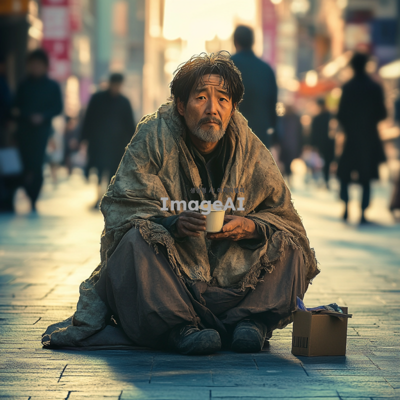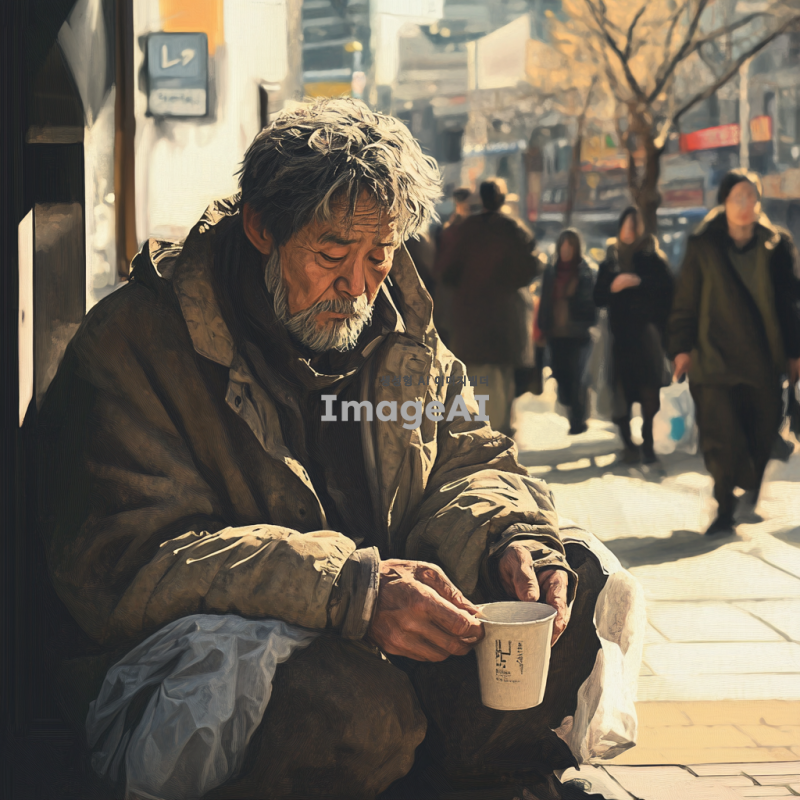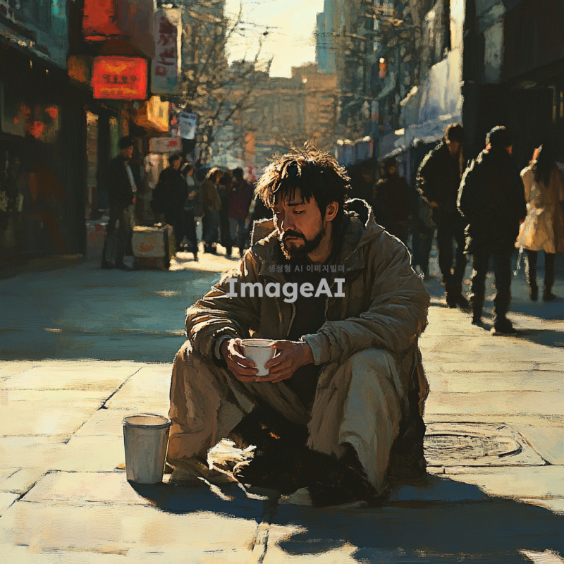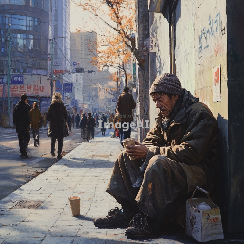 한국의 도시 거리에서 누더기를 입고 앉아 있는 거지, 슬픈 표정을 지으며 손에 작은 종이컵을 들고 있는 모습, 주변에는 지나가는 사람들과 도시의 풍경이 어우러져 있는 장면, 따뜻한 햇빛이 비추고 있는 오후의 분위기, 현실적인 스타일.