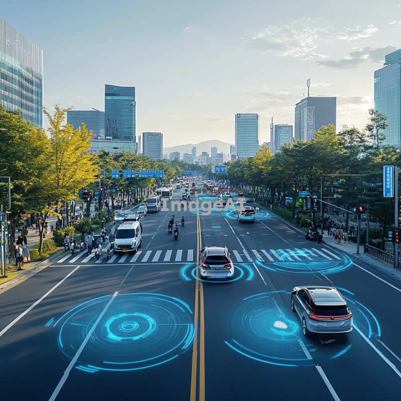 한국의 도로에서 자율주행 자동차가 주행하는 모습, 현대적인 도시 풍경과 함께 다양한 교통 신호와 보행자, 차량들이 함께 있는 장면, 미래지향적인 디자인의 자율주행차가 도로를 부드럽게 달리는 모습, 태양이 비치는 맑은 날씨, 안전하고 효율적인 교통 환경을 강조한 이미지.