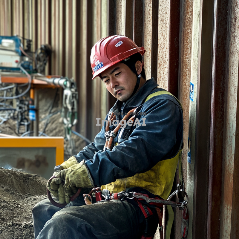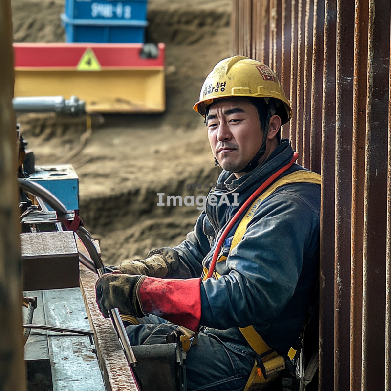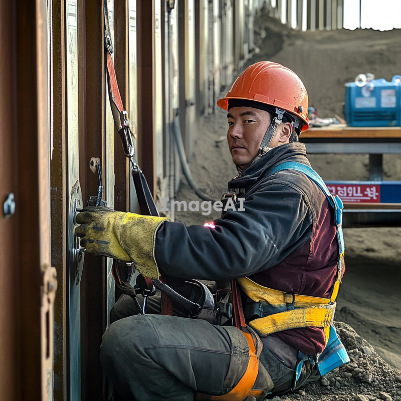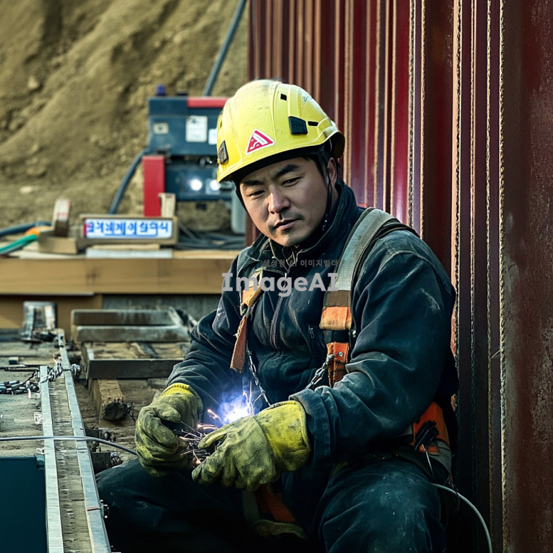 안전대 줄걸이가 설치되어 있고 안전고리를 체결한 용접 작업자가 작업 중인 모습. 작업자는 한국인 남성으로, 헬멧과 안전장비를 착용하고 있으며, 배경에는 산업 현장의 용접 기계와 작업대가 보인다. 작업자의 표정은 집중하고 있으며, 주변에는 안전 표지판과 도구들이 배치되어 있다.