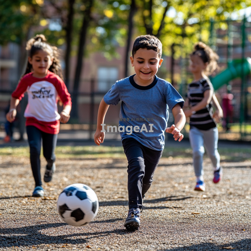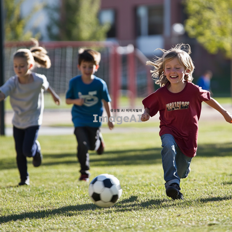 초등학교 운동장에서 축구를 하는 아이들