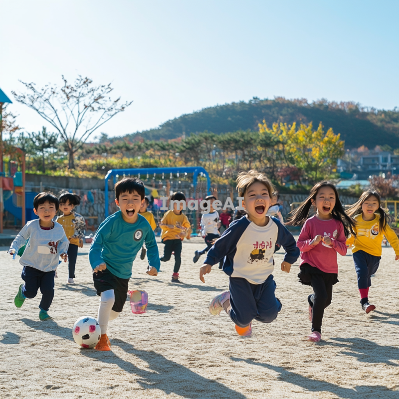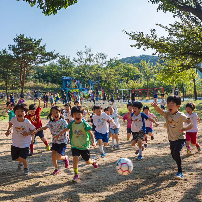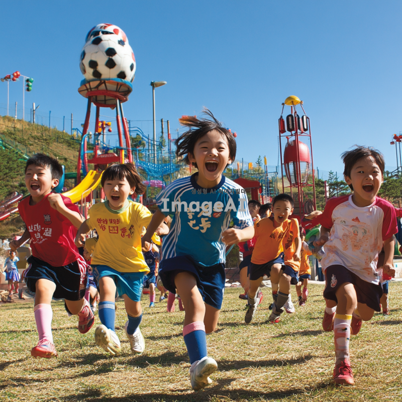 김천동부초등학교 운동장에서 20여명의 아이들이 축구를 즐기는 모습. 아이들은 다양한 색상의 유니폼을 입고 활기차게 뛰어다니며, 웃음과 즐거움이 가득한 표정을 지니고 있다. 배경에는 푸른 하늘과 운동장, 그리고 주변의 나무들이 보인다. 아이들이 공을 차고, 서로 패스를 주고받으며 팀워크를 발휘하는 장면을 강조한다.