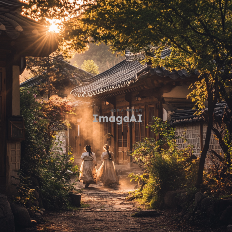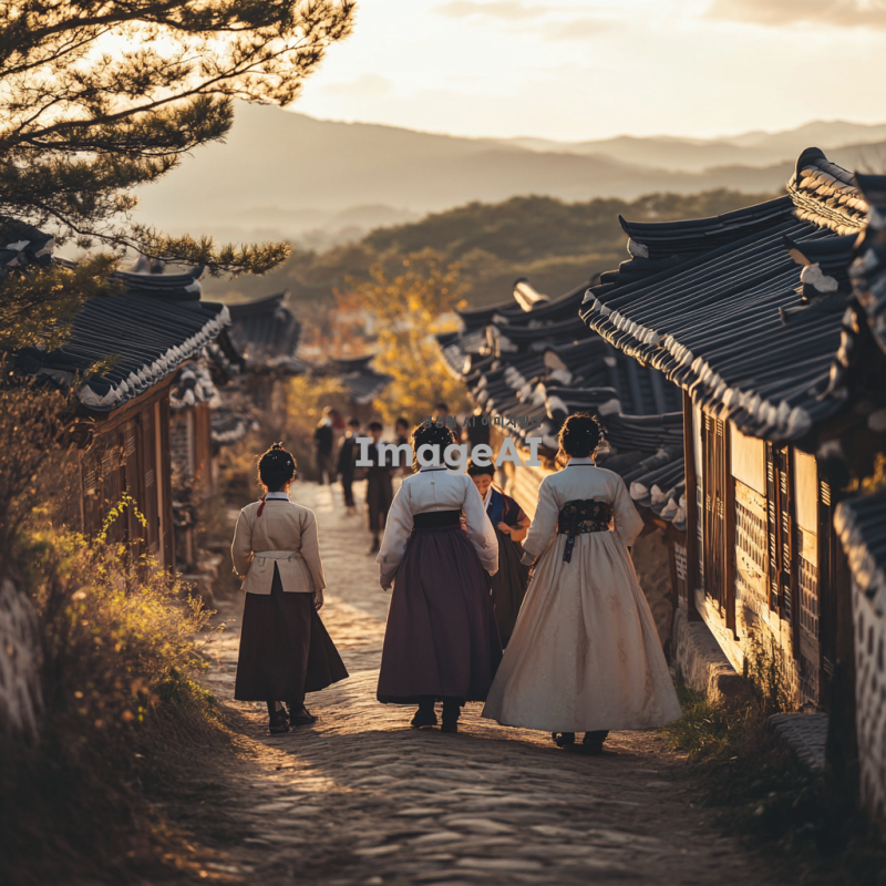 한국의 전통 마을에서 타임피버를 경험하는 사람들, 고풍스러운 한옥과 아름다운 자연 경관이 어우러진 배경, 사람들은 과거의 복장을 하고 있으며, 신비로운 빛이 주변을 감싸고 있는 모습, 따뜻한 색조와 몽환적인 분위기.