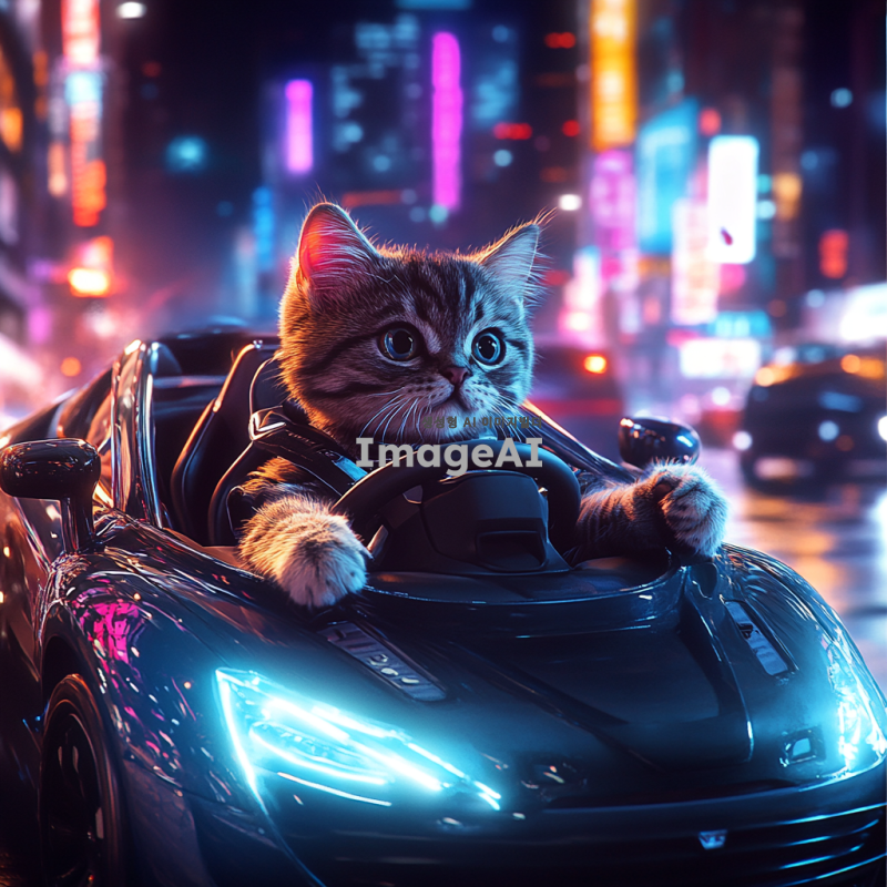 스포츠카 모양의 자율주행자동차 안에 앉아 있는 한국 고양이, 고양이는 운전대에 앞발을 올리고 귀여운 표정을 짓고 있으며, 차의 외관은 세련되고 현대적인 디자인으로, 배경은 도시의 화려한 야경으로 설정되어 있다.