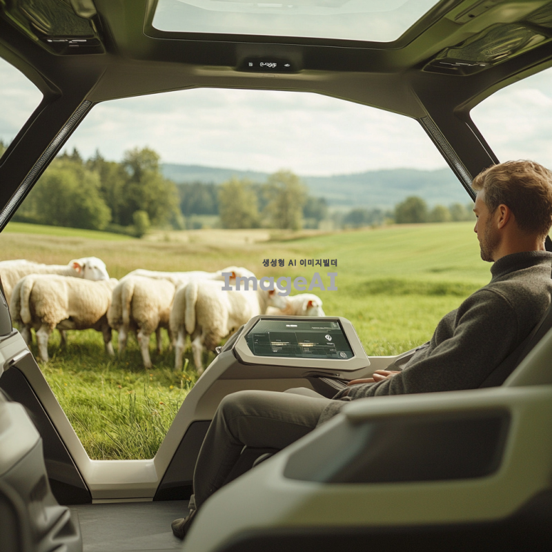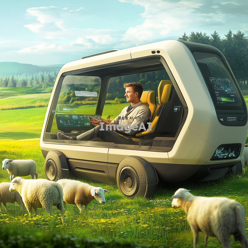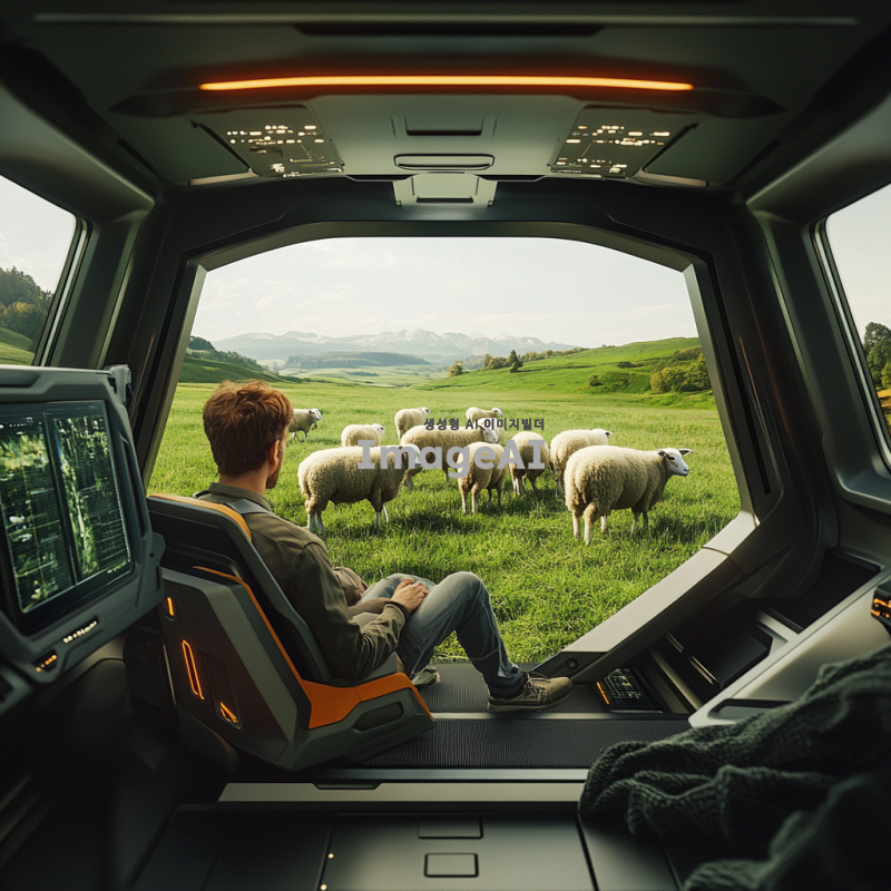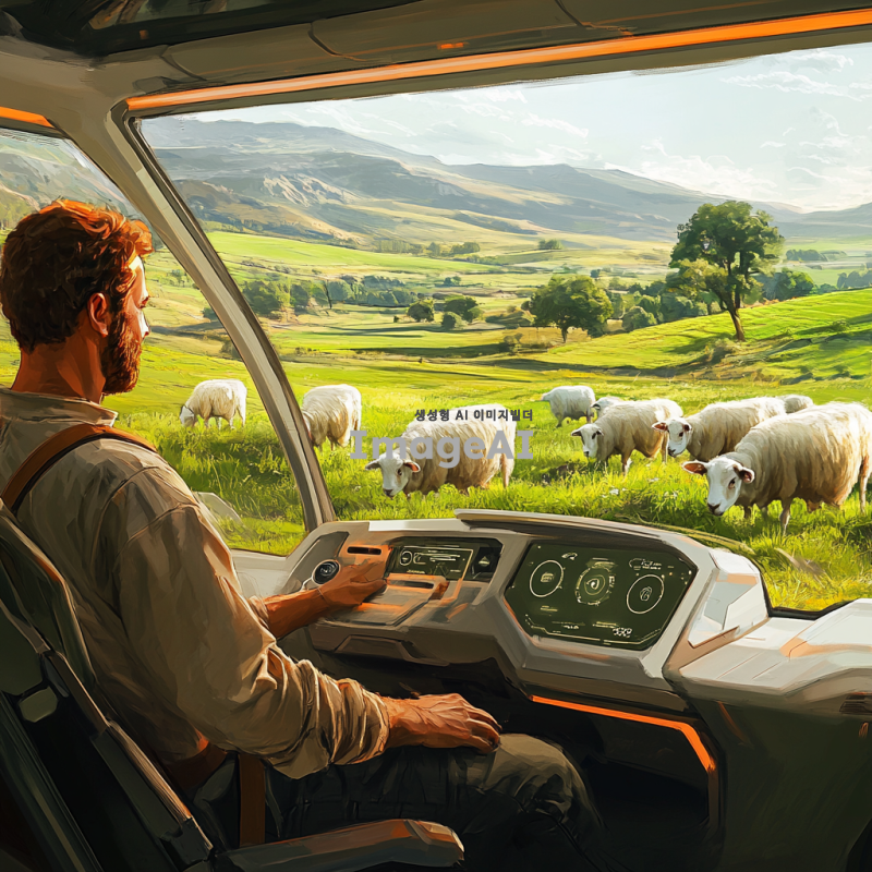 2098년의 목초지에서 30대 남성 농부가 자율주행차 안에 앉아 있는 모습. 주변에는 양 3마리와 젖소 8마리가 평화롭게 풀을 뜯고 있는 풍경. 농부는 현대적인 복장을 하고 있으며, 차의 내부는 첨단 기술로 가득 차 있다. 푸른 목초지와 맑은 하늘이 배경을 이루고 있다.