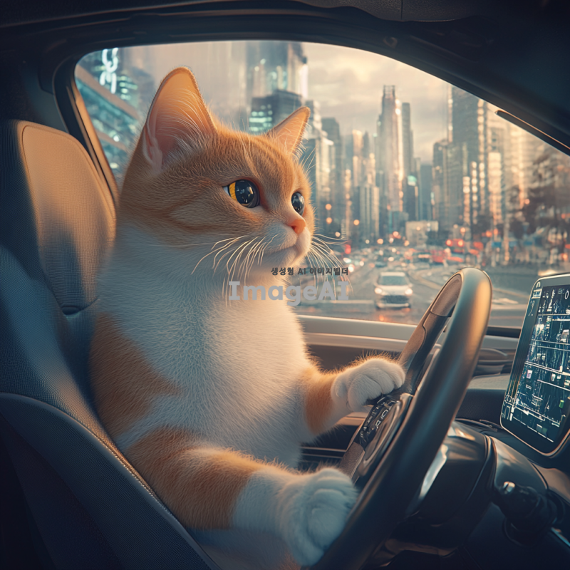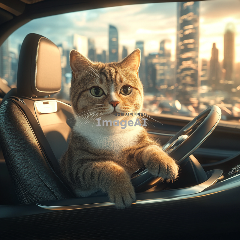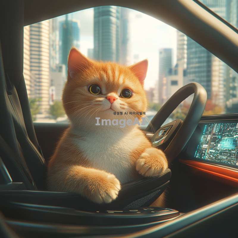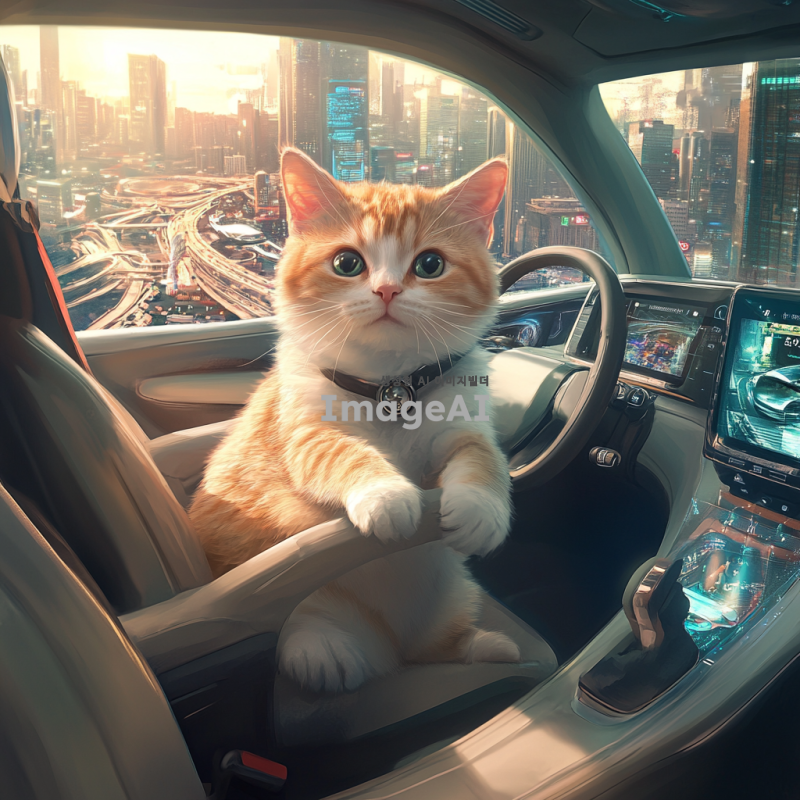 자율주행 자동차의 운전석에 앉아 있는 한국 고양이. 고양이는 귀여운 표정을 짓고 있으며, 자동차의 내부는 현대적이고 세련된 디자인으로 꾸며져 있다. 창밖에는 도시 풍경이 펼쳐져 있고, 햇살이 비치고 있다. 고양이의 털은 부드럽고 윤기 나며, 자동차의 스티어링 휠에 앞발을 올리고 있는 모습.