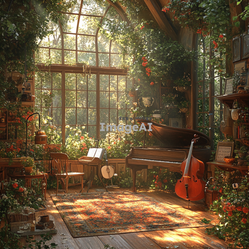 숲속에 위치한 아늑한 음악실, 자율주행 자동차가 창가에 세워져 있는 모습, 햇살이 부드럽게 들어오고 주변에 푸른 나무와 화사한 꽃들이 만개해 있는 따뜻한 분위기, 음악 악기들이 고요히 놓여 있는 공간, 자연과 조화롭게 어우러진 편안한 느낌.