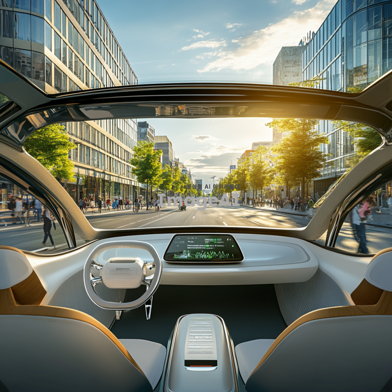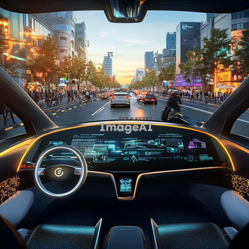 자율주행 자동차가 도로를 주행하는 모습, 현대적인 도시 배경, 다양한 건물과 보행자가 있는 거리, 자동차의 내부 모습이 보이는 각도에서 촬영, 미래적인 디자인의 자율주행차, 안전하고 편안한 분위기, 낮 시간의 맑은 날씨, 자연광이 잘 드는 환경, 기술적인 요소가 강조된 세부 묘사