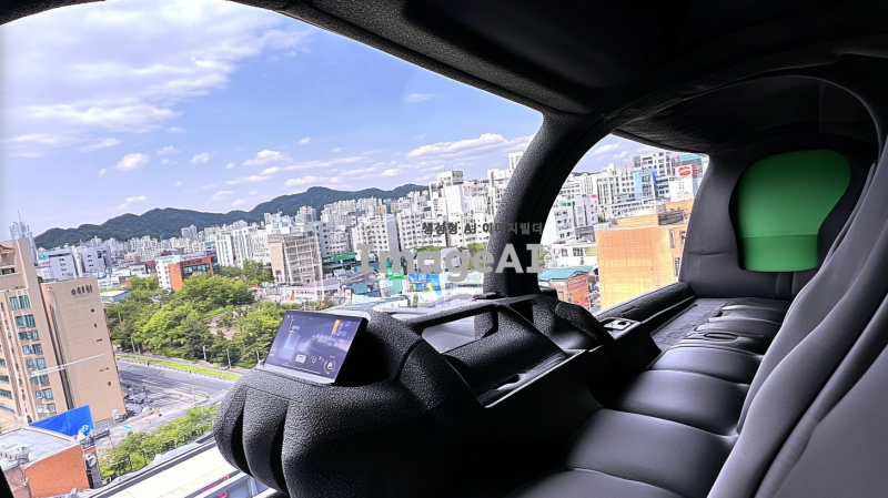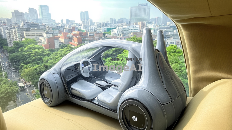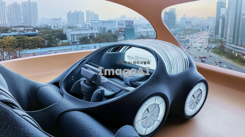 한국의 도심을 배경으로 한 미래형 자율주행차의 모습을 그려줘. 차량은 매끄러운 디자인과 첨단 기술이 적용된 외관을 가지고 있으며, 주변에는 현대적인 건물과 녹지 공간이 어우러져 있다. 차창을 통해 내부에는 편안한 좌석과 고급스러운 인테리어가 보인다. 하늘은 맑고 푸르며, 도로에는 다른 차량과 보행자들이 자연스럽게 공존하는 모습이 담겨 있다.