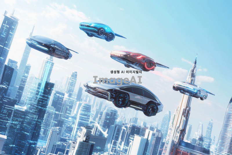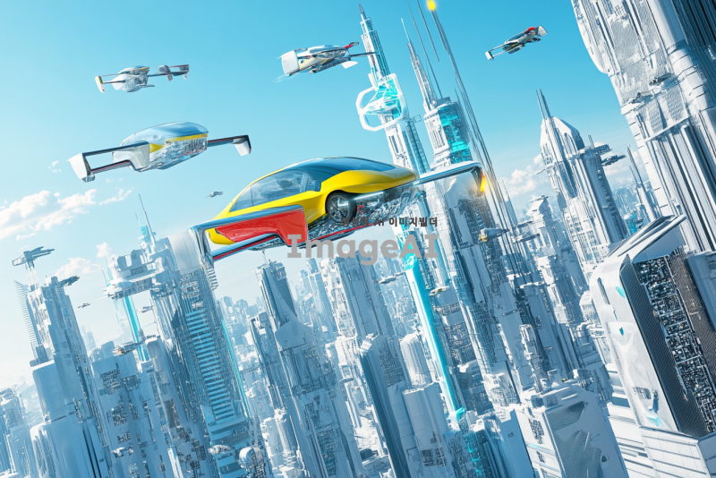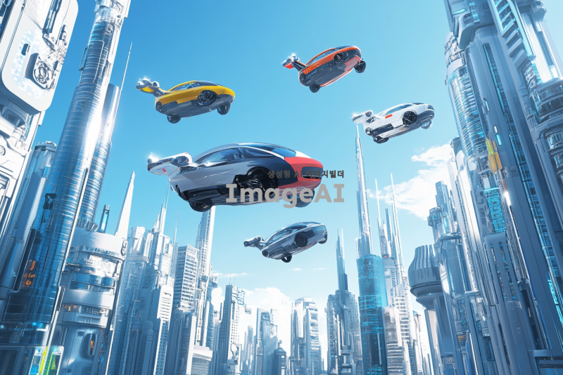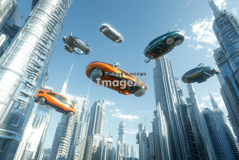 미래의 도시 풍경 속에서 하늘을 나는 자율주행 자동차들이 자유롭게 비행하고 있는 모습. 현대적인 디자인의 자동차들이 다양한 색상으로 하늘을 가로지르며, 주변에는 고층 빌딩과 미래적인 구조물들이 어우러져 있는 장면. 맑은 파란 하늘과 함께 미래 기술의 발전을 상징하는 요소들이 포함된 이미지.