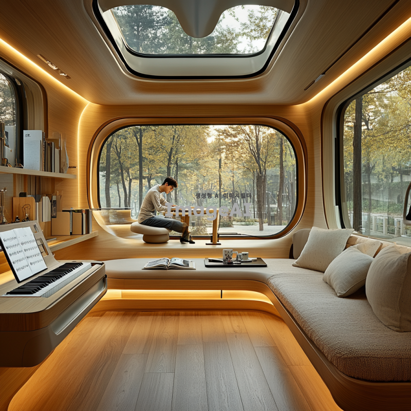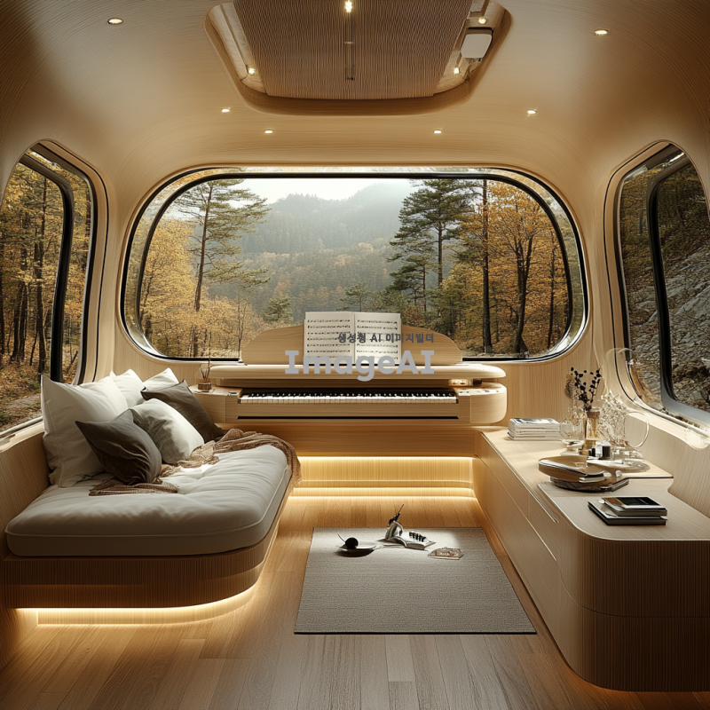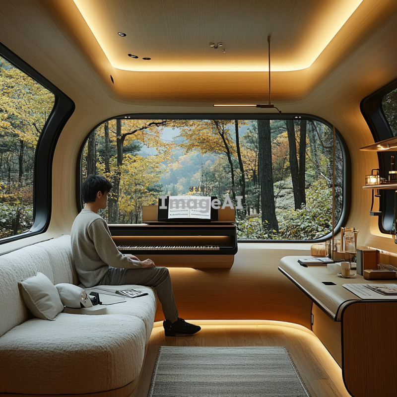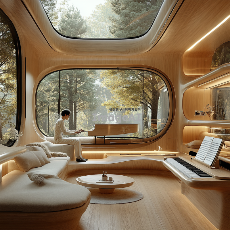 차 안에 피아노가 있는 음악실이 있는 자율주행 자동차 내부, 아늑하고 따뜻한 분위기, 부드러운 조명과 나무 재질의 인테리어, 창문 밖으로 보이는 자연 풍경, 편안한 소파와 악보가 놓인 테이블, 음악을 연주하는 한국인 남성, 차분하고 조화로운 느낌의 공간