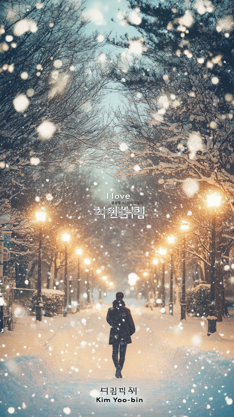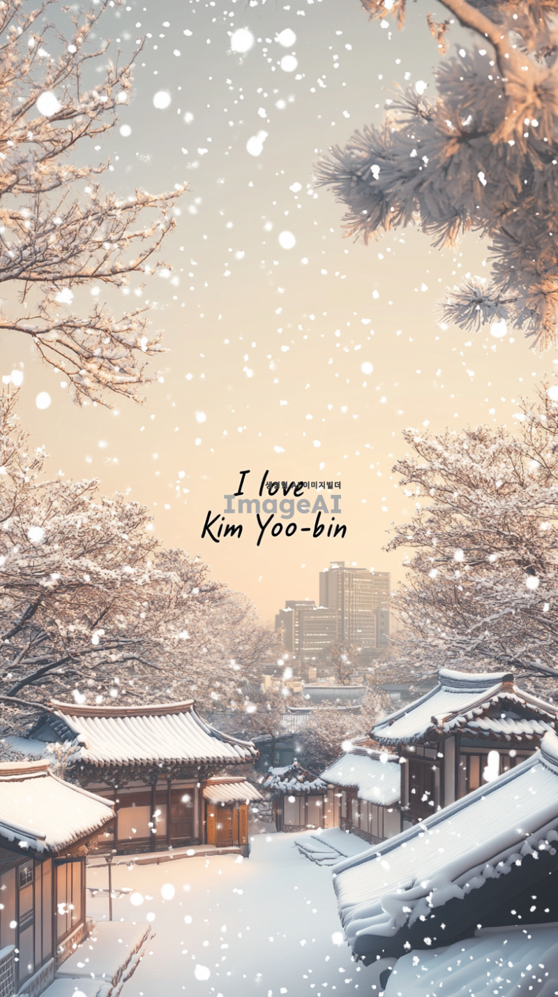 눈 덮인 겨울 풍경 속에서 따뜻한 빛이 나는 성스러운 분위기, 하늘에는 부드러운 눈송이가 내리고, 나무들은 하얀 눈으로 덮여 있으며, 중앙에는 "김유빈 사랑해"라는 문구가 아름다운 서체로 새겨져 있는 장면. 전체적으로 따뜻한 느낌과 평화로운 감정이 느껴지도록 표현.