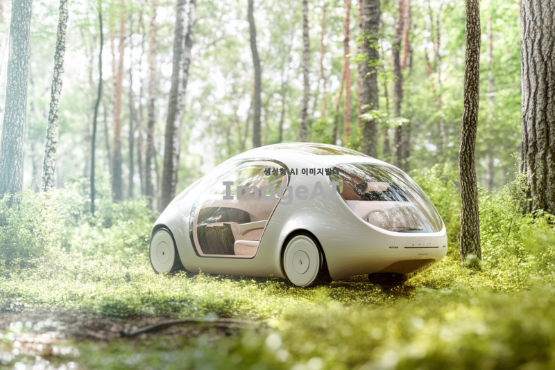 숲속을 다니는데 외부에선 안보이지만 내부에선 천장과 벽면이 투명이라 잘보이고 자연친화적 소재를 사용하며 태양열로 움직이고 지면에서 살짝 떠있는 자율주행자동차를 그려줘