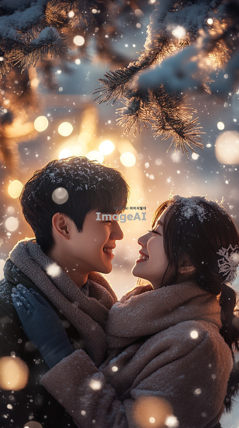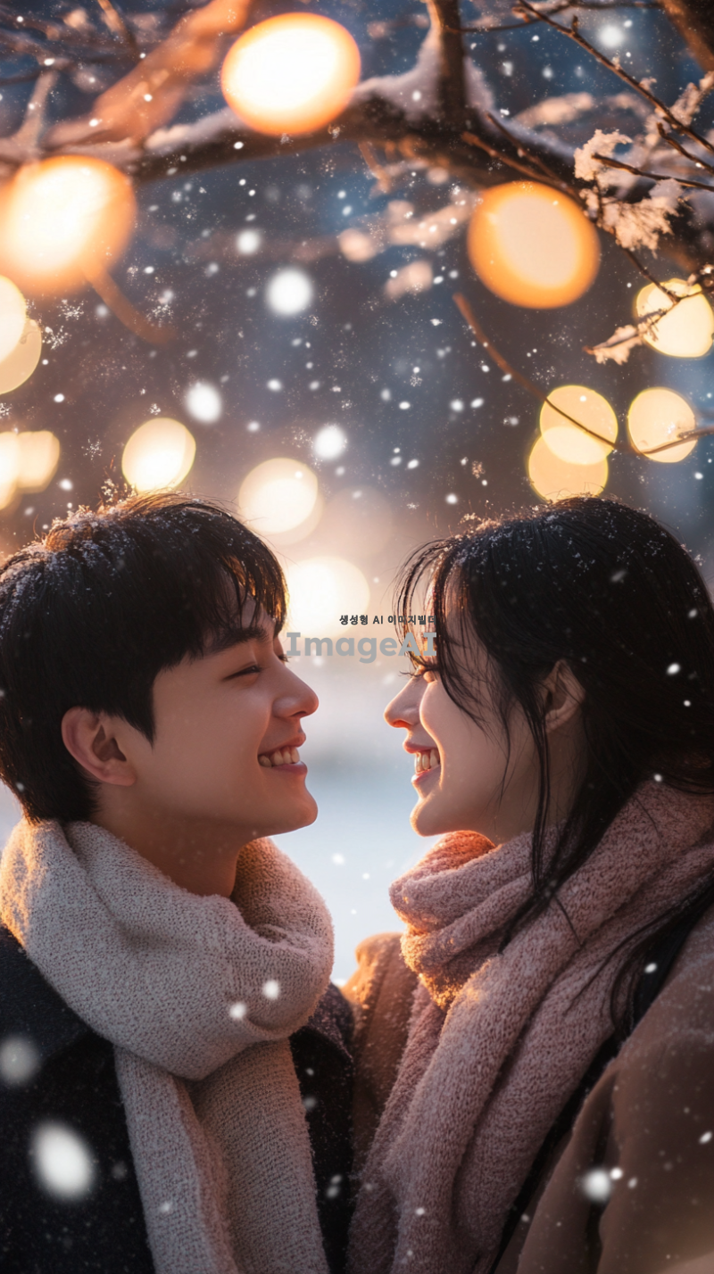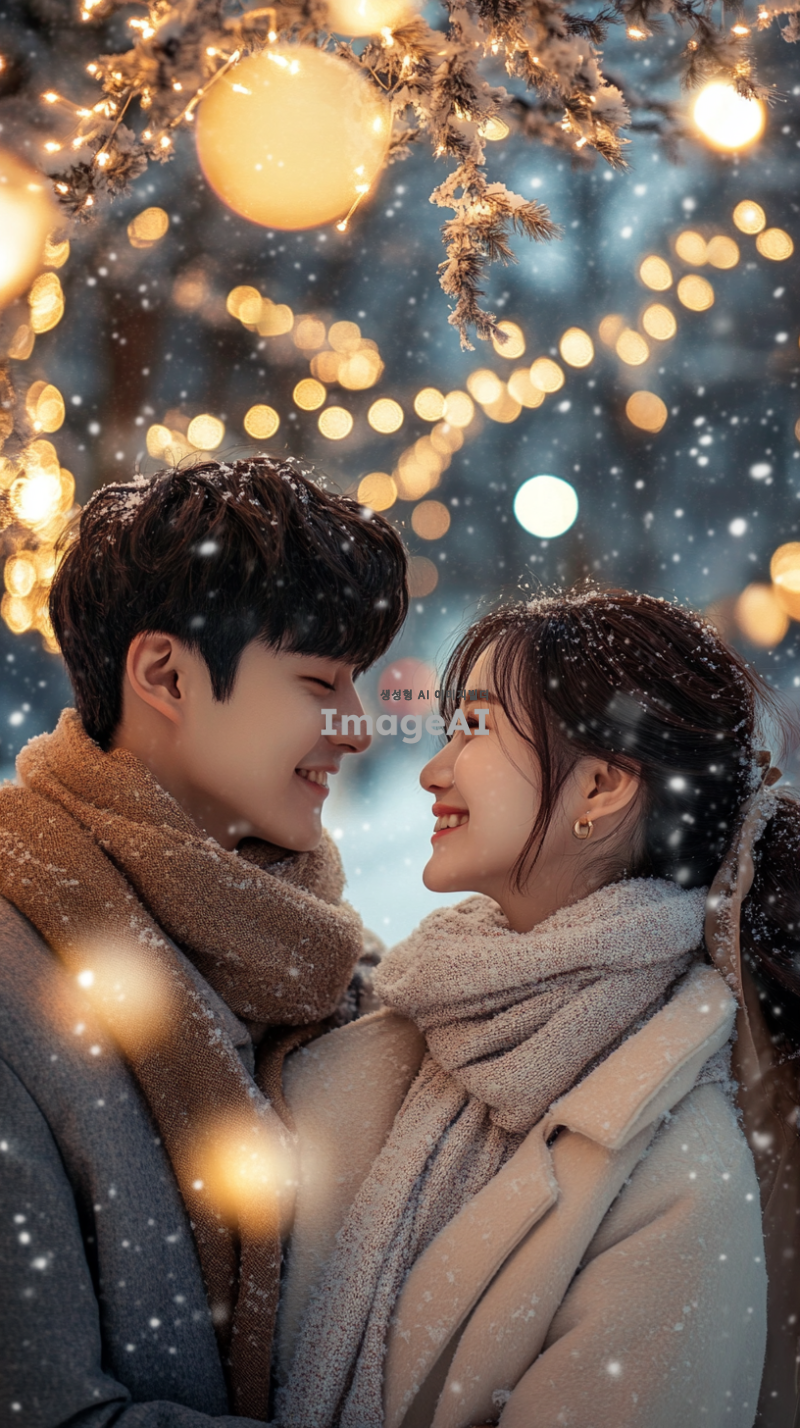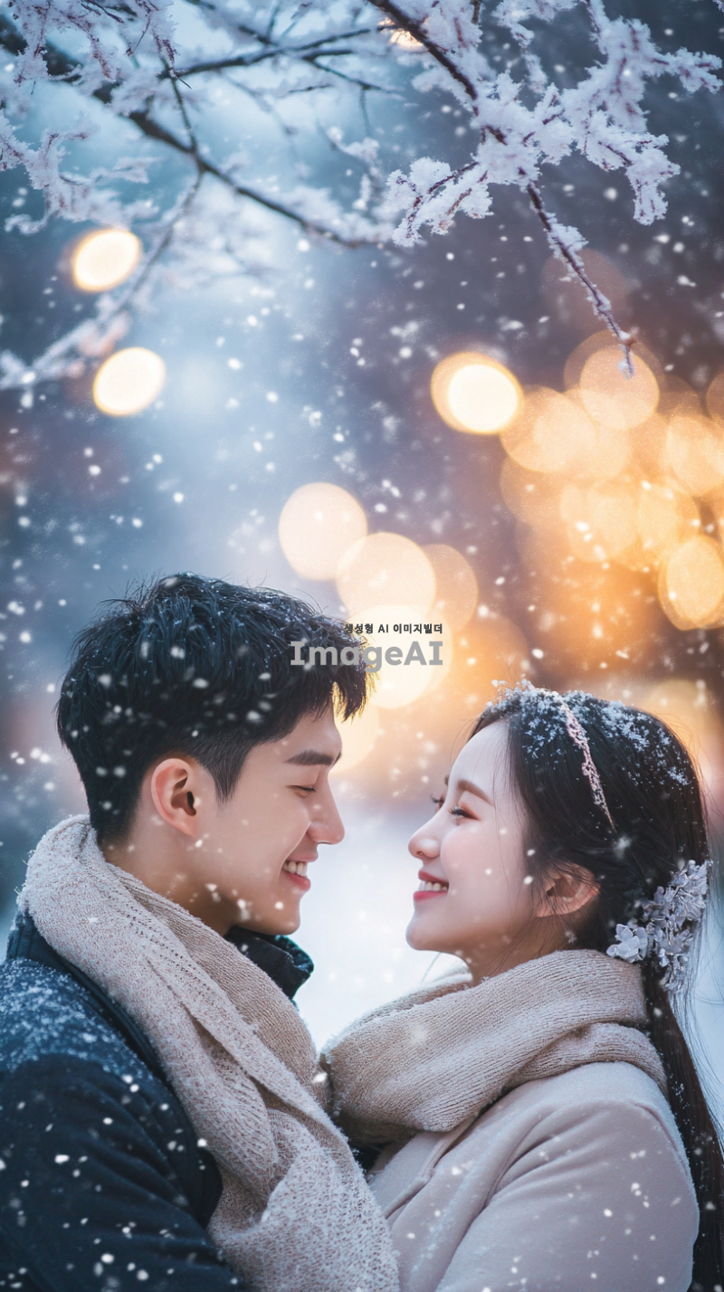 겨울의 차가운 공기 속에서 따뜻한 사랑을 나누는 두 한국인 커플. 눈이 소복이 쌓인 나무 아래에서 서로를 바라보며 미소 짓고 있는 모습. 그들의 주위에는 반짝이는 눈꽃과 따뜻한 조명이 어우러져 성스러운 분위기를 자아내고, 배경에는 은은하게 빛나는 겨울 하늘이 펼쳐져 있다. 따뜻한 스카프와 장갑을 착용한 그들의 모습은 사랑과 온기를 전달하며, 겨울의 아름다움을 강조한다.
