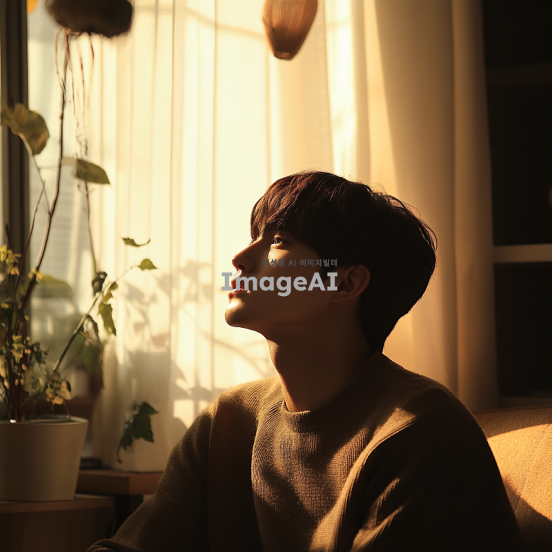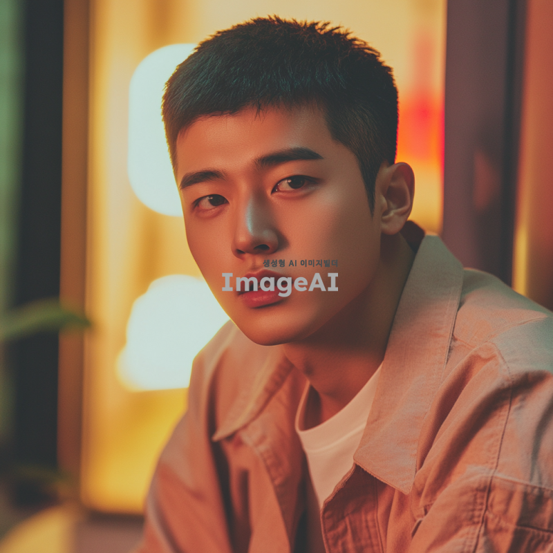 쌍거풀이 없고 키가 180cm 이상인 짧은 머리의 동글동글한 얼굴형을 가진 한국 남성, 자연스러운 표정, 실내에서 편안하게 앉아 있는 모습, 부드러운 조명, 따뜻한 색감