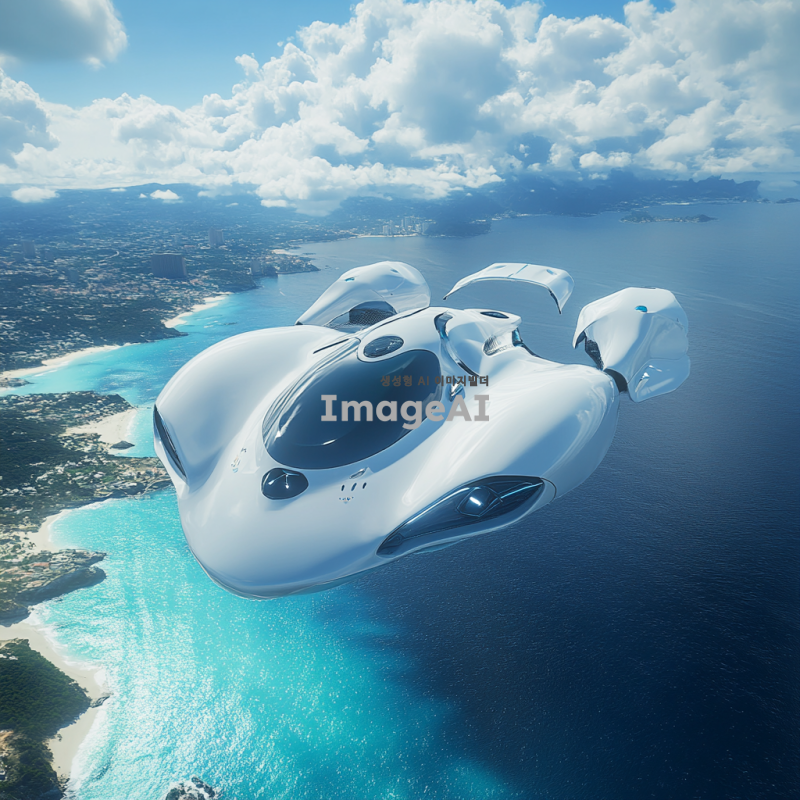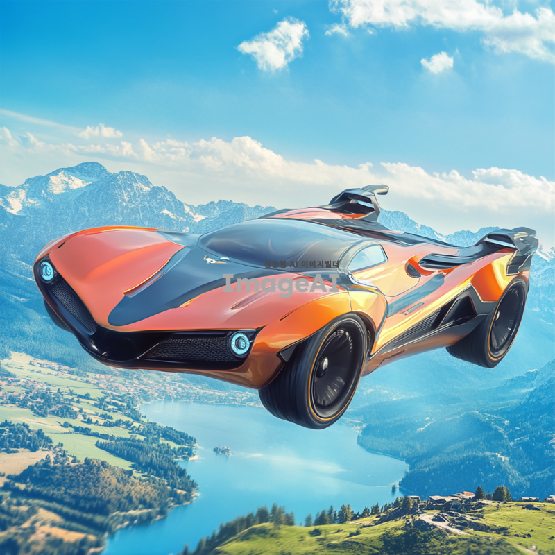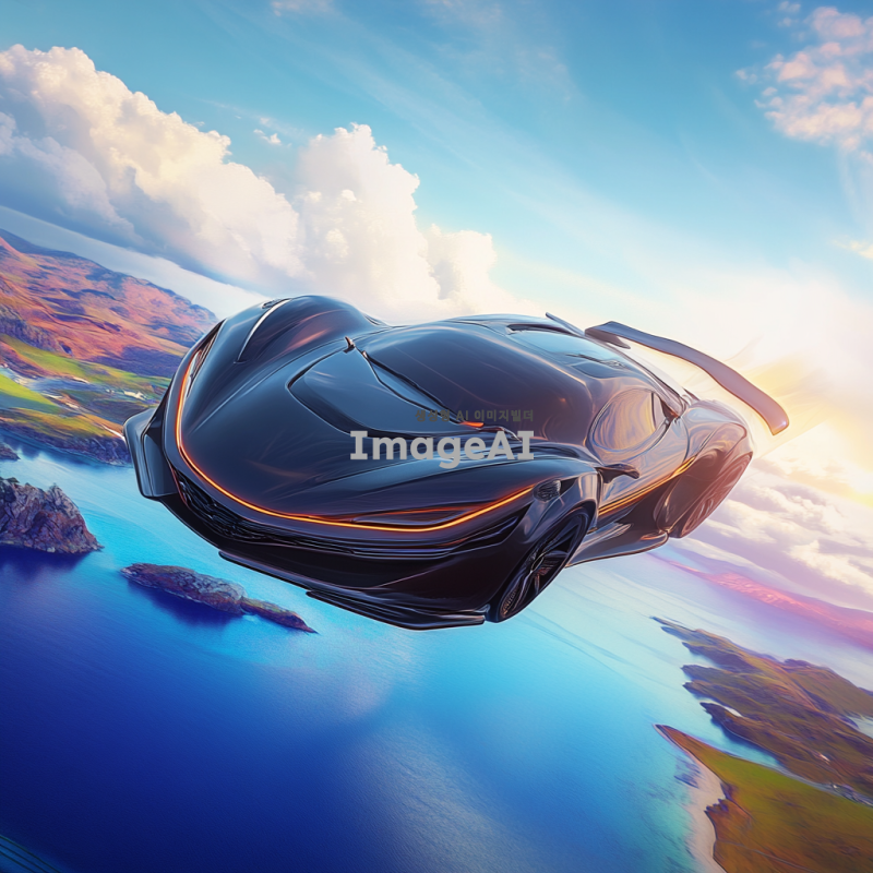 멋진 디자인의 슈퍼카가 하늘을 날고 있는 모습, 공중에서 땅과 물을 동시에 탐험하는 장면, 미래적인 요소가 가미된 독창적인 외관, 유선형의 차체와 화려한 색상, 주변 풍경은 푸른 하늘과 맑은 바다, 그리고 드넓은 초원으로 구성된 이미지.