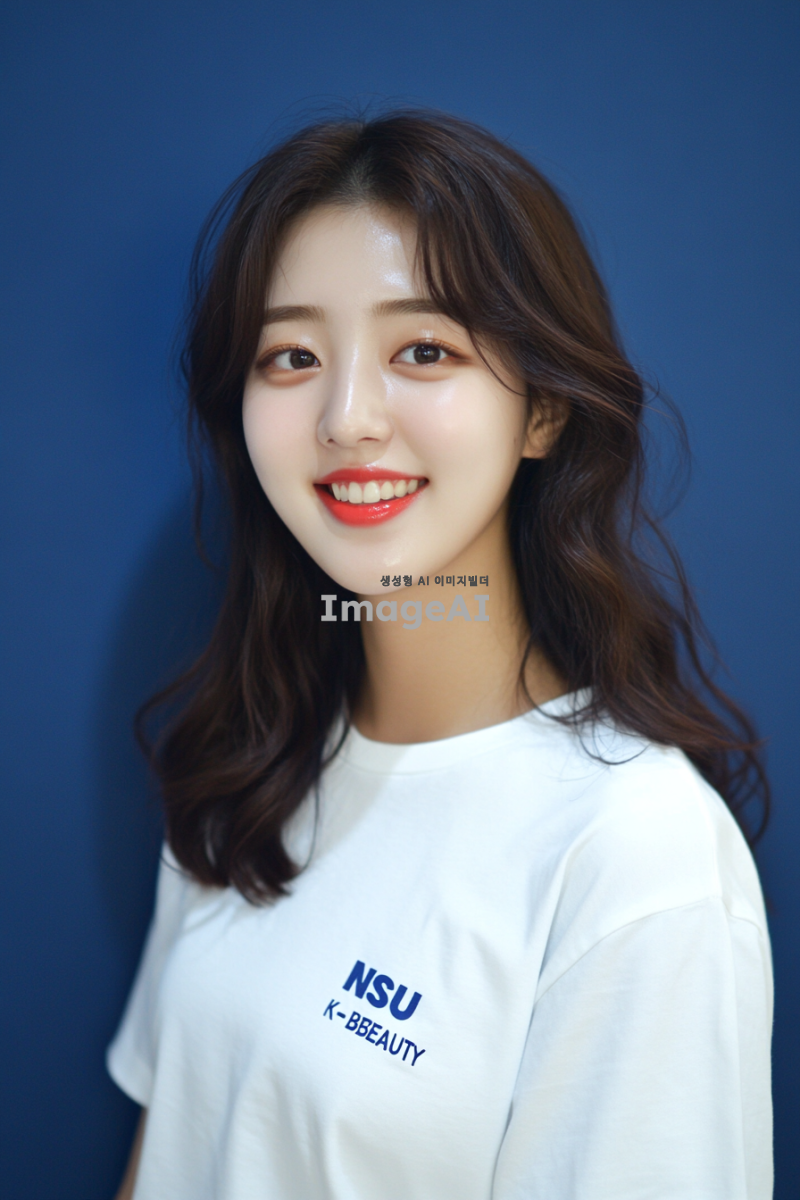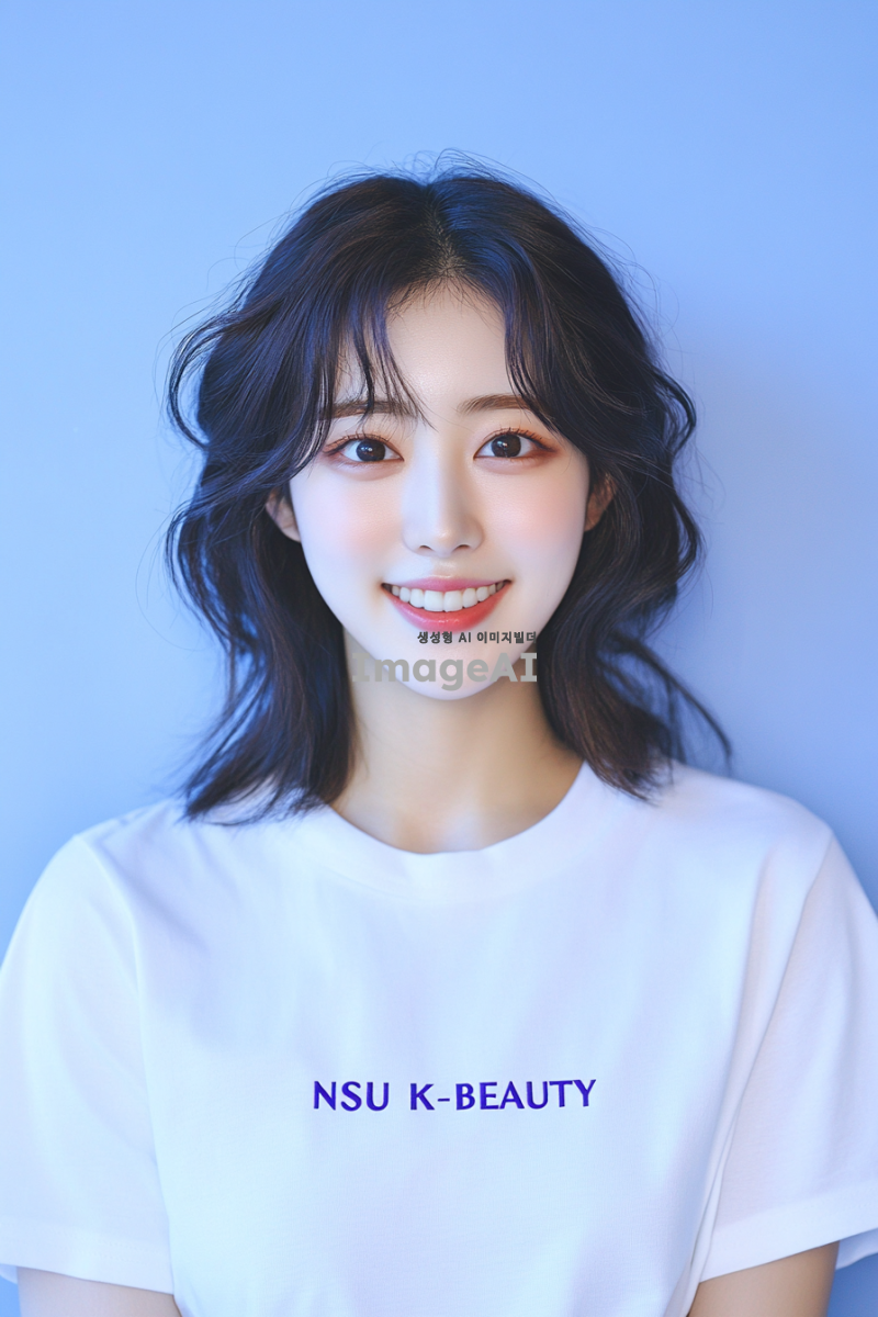 단색 배경 앞에 서 있는, 얼굴이 예쁘고 화려한 아이돌 화장을 한 20대 초반의 한국 여성. 그녀는 흰색 티셔츠를 입고 있으며, 티셔츠에는 "NSU K-BEAUTY"라는 문구가 적혀 있다. 자연스러운 포즈로 카메라를 바라보며 미소 짓고 있는 모습.