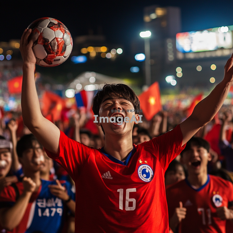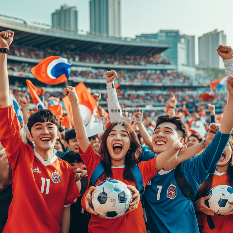베트남의 축구 경기장에서 열띤 응원을 하는 한국인 팬들, 다양한 팀의 유니폼을 입고 있는 사람들, 축구공과 깃발을 들고 있는 모습, 배경에는 베트남의 도시 풍경과 축구 경기장, 활기찬 분위기와 열정적인 응원 소리, 생동감 넘치는 색감으로 표현된 장면.