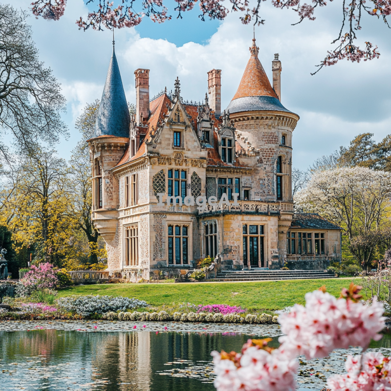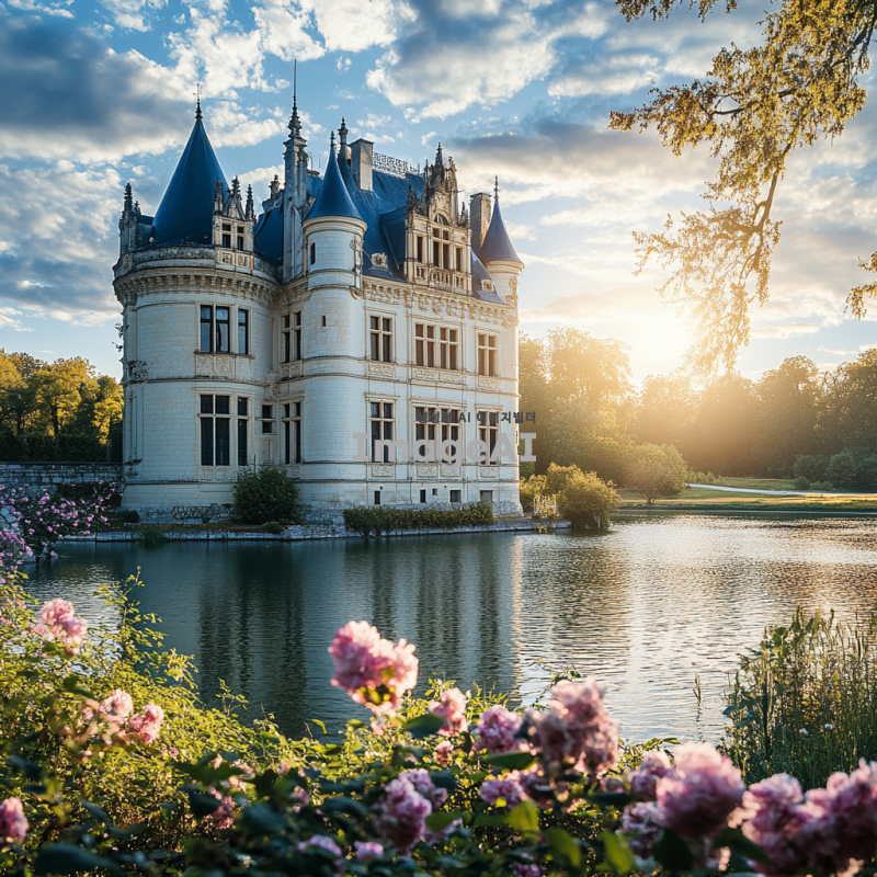 아름다운 경치 속에 위치한 평화로운 성, 푸른 하늘과 흰 구름이 떠 있는 배경, 성 주변에는 꽃이 만발한 정원과 맑은 호수가 있는 모습, 따뜻한 햇살이 비추는 장면, 고풍스러운 건축 양식과 섬세한 디테일이 돋보이는 성의 외관, 조용하고 평화로운 분위기.