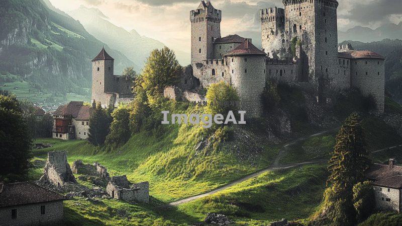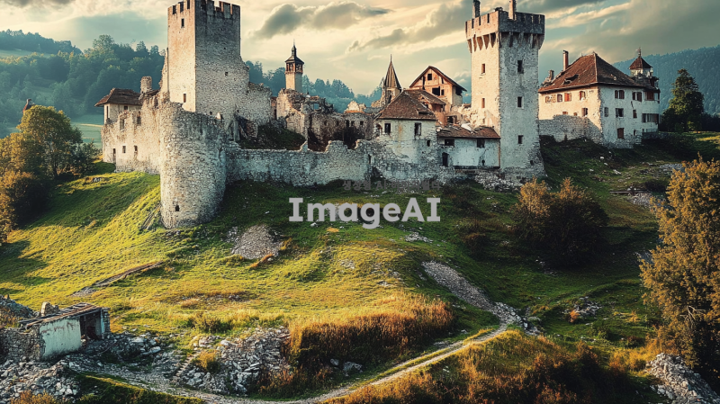 전쟁으로 파괴되고 폐허가 된 중세 성, 잔해와 먼지로 가득 찬 풍경, 부서진 성벽과 무너진 탑, 푸른 식물들이 자생하는 모습, 흐린 하늘 아래 음침한 분위기, 고대의 흔적이 남아있는 잔해들, 전투의 상처가 남아있는 배경