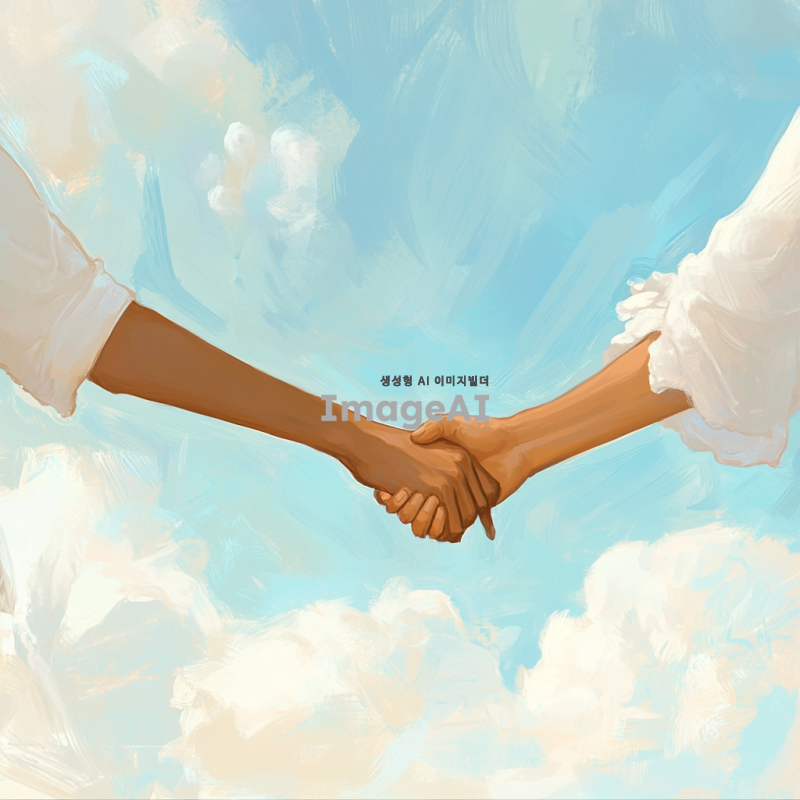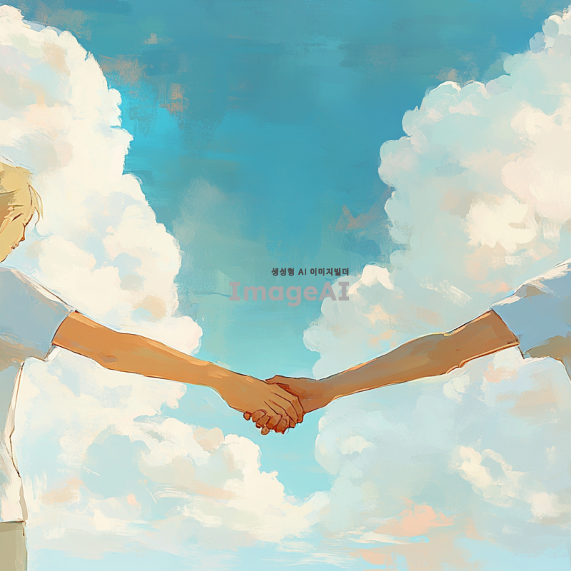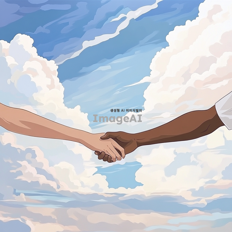 두 사람이 손을 맞잡고 있는 모습, 팔까지만 보이고, 배경에는 푸른 하늘과 흰 구름이 떠 있는 장면, 따뜻한 햇살이 비추는 느낌, 부드러운 색감, 평화롭고 사랑스러운 분위기