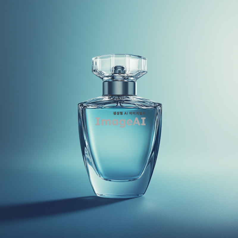 파란색 배경 위에 우아한 디자인의 향수 병이 놓여져 있는 이미지, 향수 병은 세련된 형태와 고급스러운 라벨이 특징이며, 배경은 부드러운 그라데이션으로 처리되어 있어 향수의 매력을 강조함.
