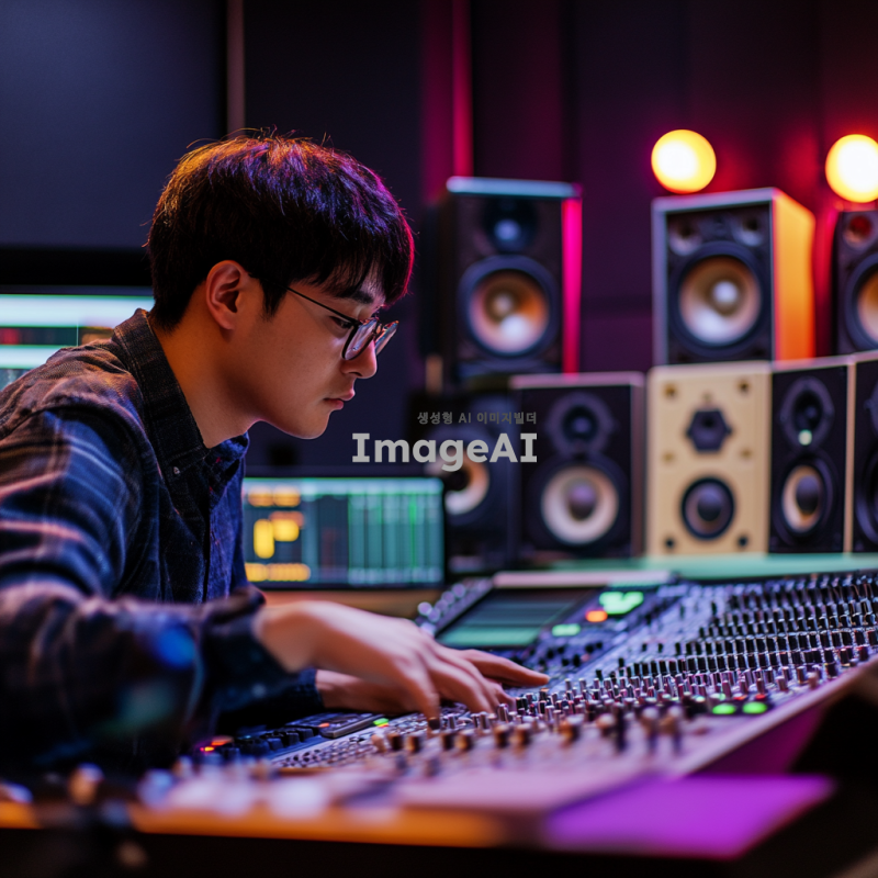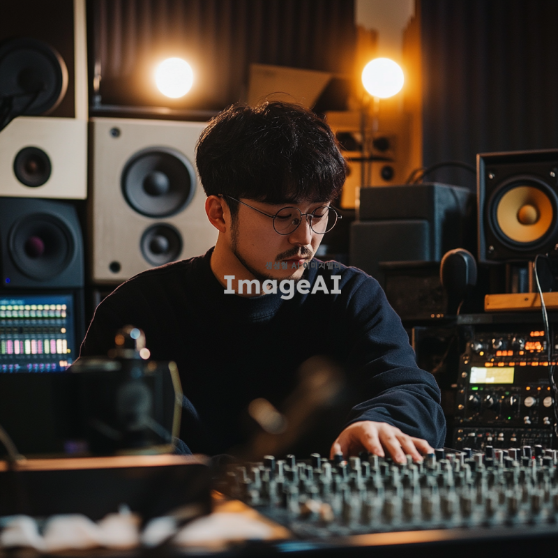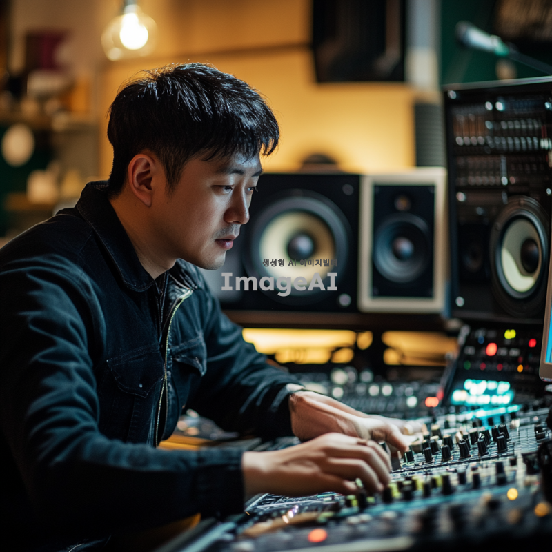 한국의 음향감독이 스튜디오에서 작업 중인 모습, 다양한 음향 장비와 믹서가 배치된 환경, 집중하는 표정과 함께 음향 효과를 조정하는 손길, 주변에 스피커와 마이크가 놓여 있는 세밀한 디테일, 조명이 부드럽게 비추는 분위기, 창의적인 작업 공간의 느낌을 강조하여 표현해 주세요.