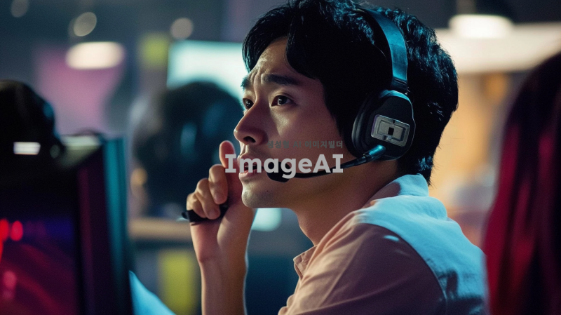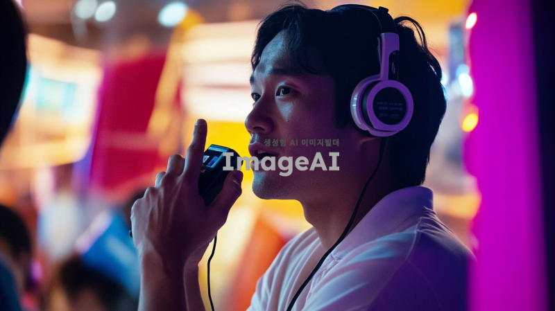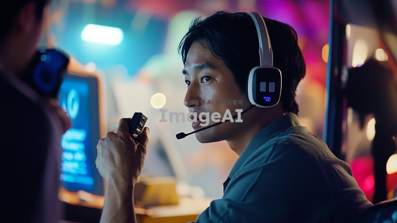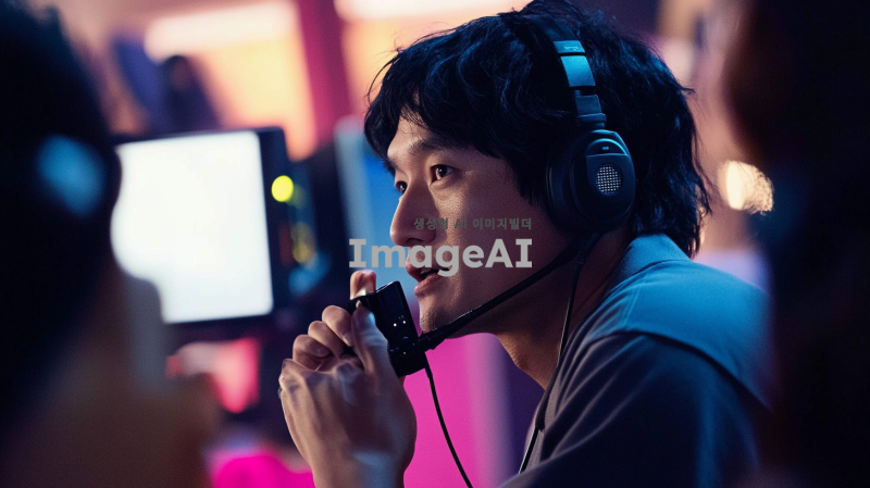헤드셋을 착용한 한국인 감독이 무전기를 들고 무전하는 모습, 긴장감 있는 연출, 집중한 표정과 함께 팀원들과 소통하는 장면,공연장, 생동감 넘치는 색감,