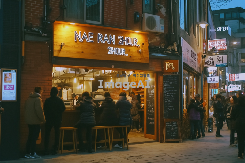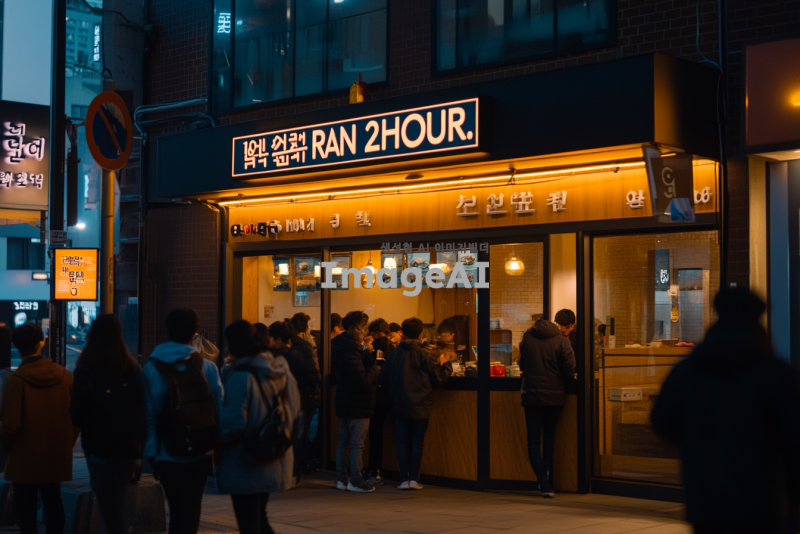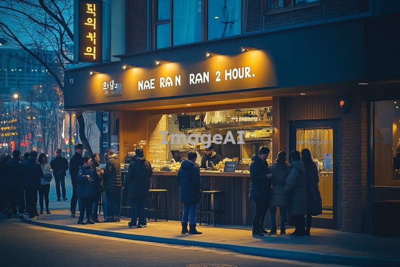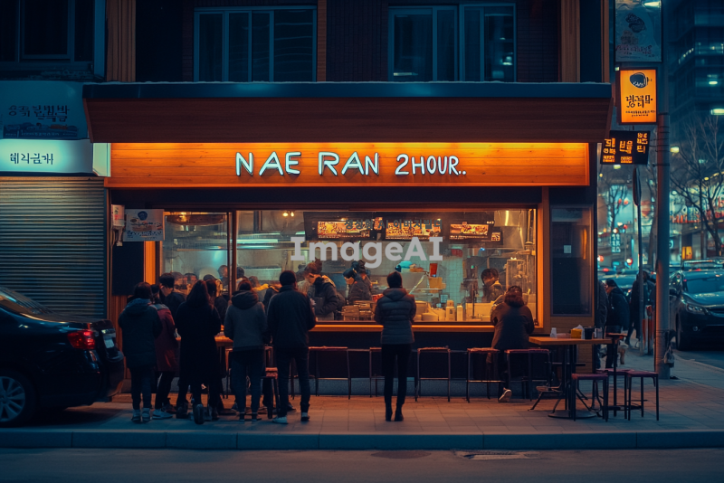 사람들이 줄지어 서 있는 식당 앞 입간판에 "NAE RAN 2HOUR"라는 문구가 적혀 있는 장면. 식당은 현대적이고 아늑한 분위기를 가지고 있으며, 주변에는 다양한 사람들이 대기하고 있는 모습. 입간판은 눈에 띄는 디자인으로, 한국적인 요소가 가미되어 있다. 배경에는 도시의 거리 풍경이 보이고, 저녁 시간대의 따뜻한 조명이 분위기를 더하고 있다.