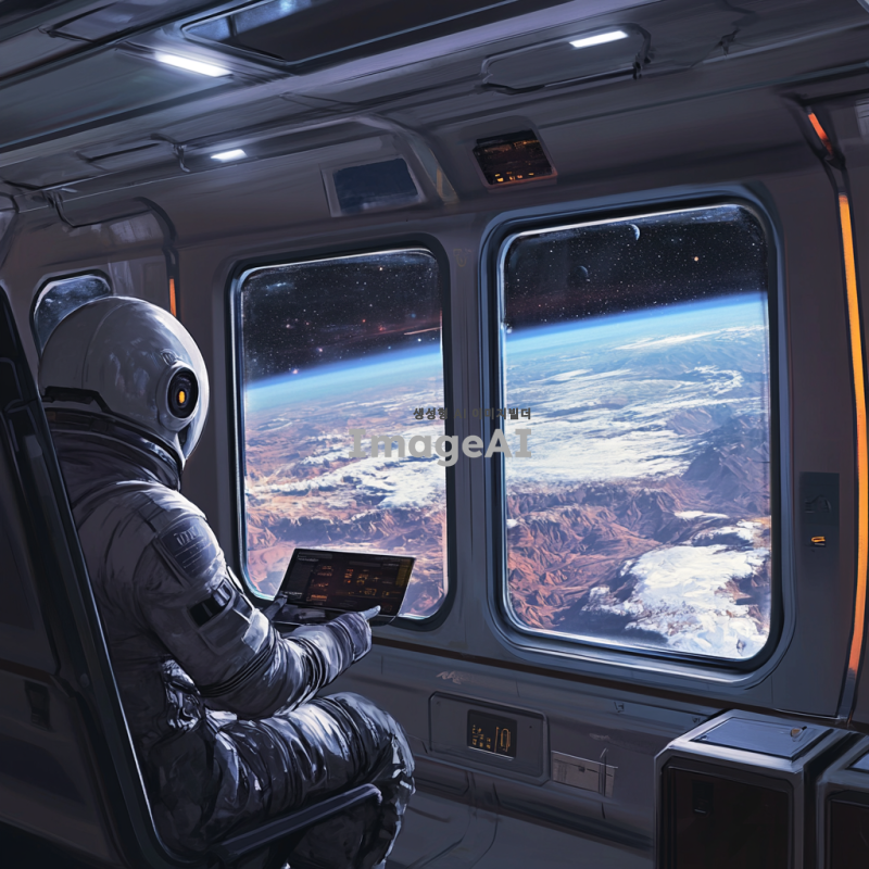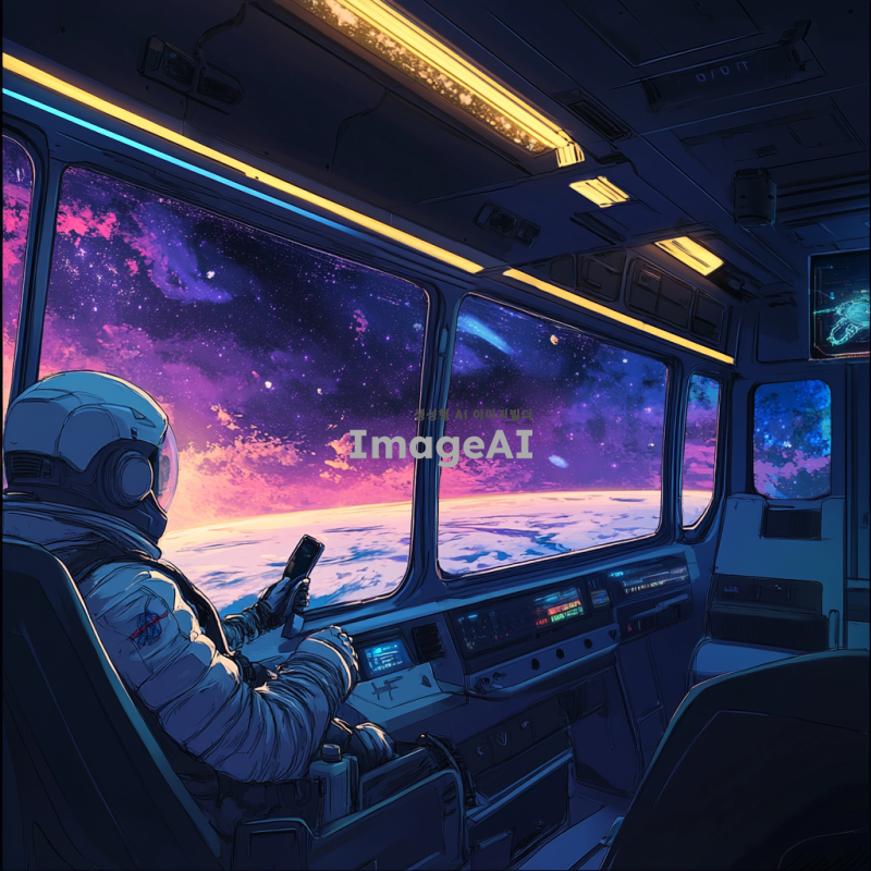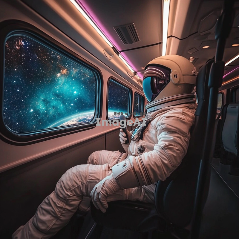 우주버스를 제작해줘 안에서 찍은 시점이고 창 밖의 유리창에는 우주 풍경이 보여야 해 버스는 꼭 직사각형의 관광버스 같은 느낌으로 제작해줘야 해 우주복을 입고 마이크를 들고있 가이드도 한 명 있으면 좋아