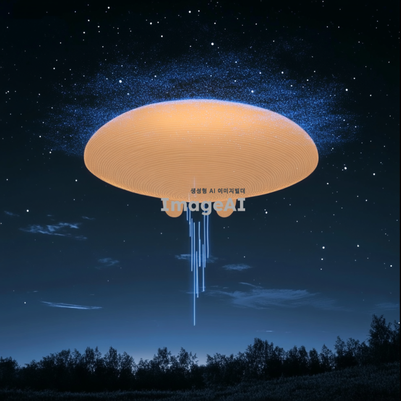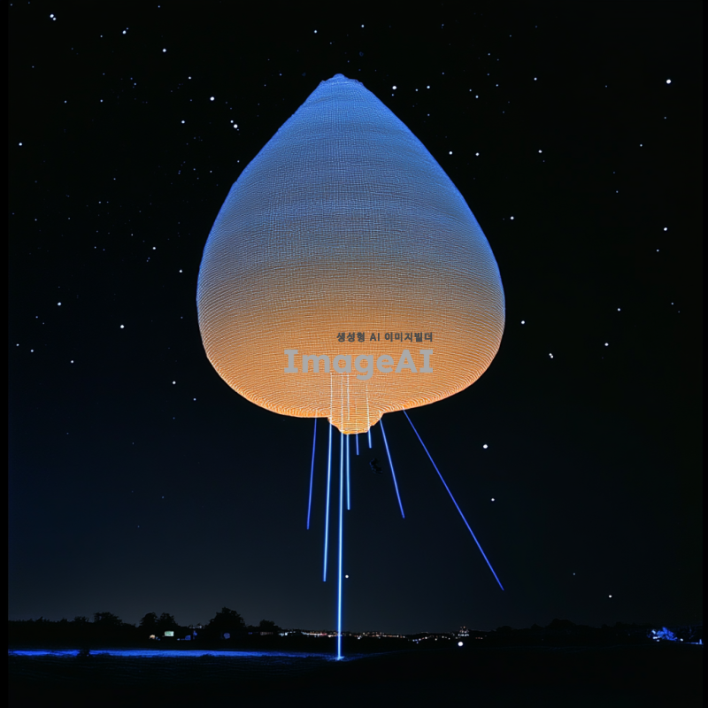 밤하늘에서 홀로그램 쇼를 하고있는데 홀로그램의 모양은 밑에 첨부한 이미지에서 모양만 따서 실제 홀로그램처럼 만들어줘 밑에서 엄청난 빛을 선으로 쏘고있는 듯한 것도 추가해줘