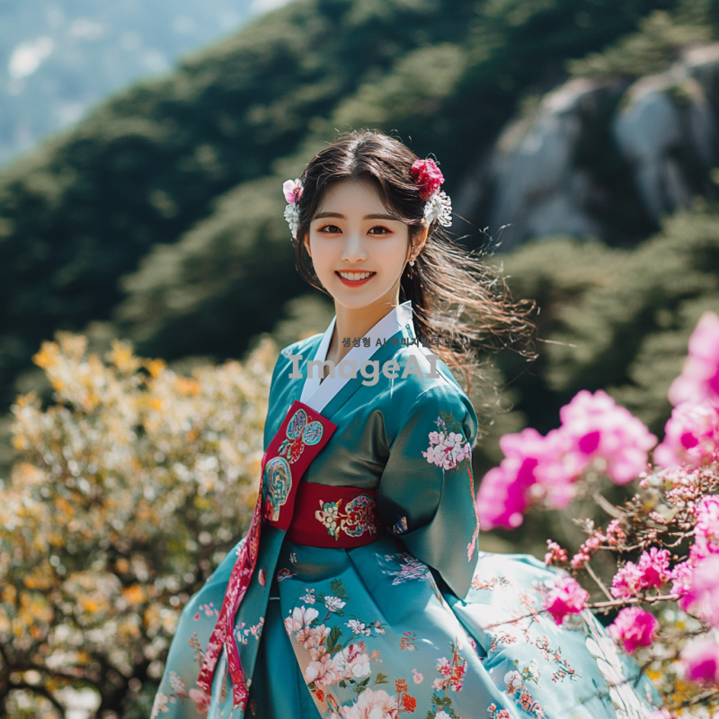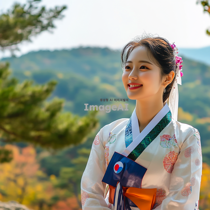 한국 국기 무늬가 장식된 전통 한복을 입고 있는 한국 여성, 배경은 아름다운 한국의 자연 풍경, 밝고 생동감 있는 색감으로 표현, 여성의 표정은 자부심과 기쁨이 가득한 모습.