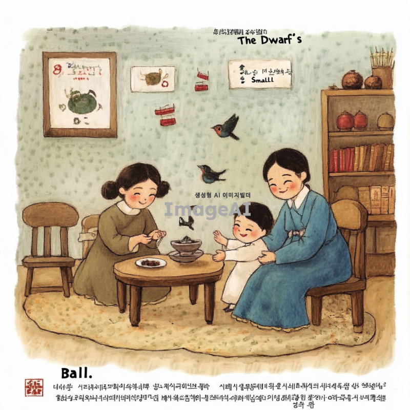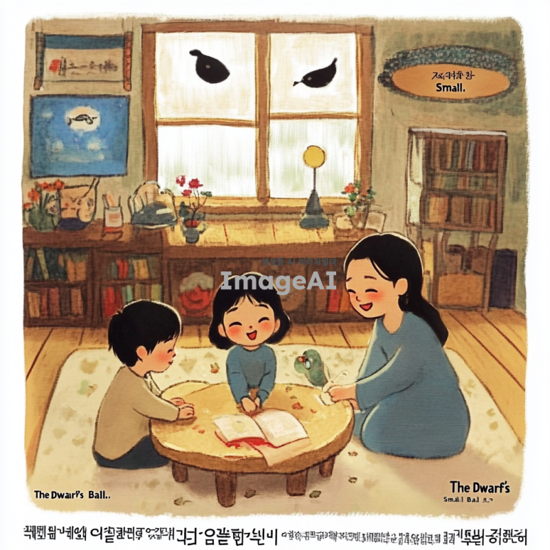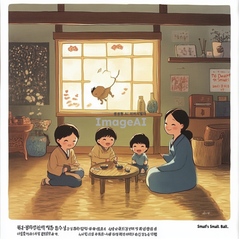 한국 소설 '난장이가 쏘아올린 작은 공'의 가족을 주제로, 따뜻한 분위기의 거실에서 함께 시간을 보내고 있는 한국인 가족의 모습을 그려주세요. 부모님과 아이들이 웃으며 대화하는 장면, 가족이 함께 모여 있는 소중한 순간을 담아내고, 그들의 표정과 따뜻한 감정이 잘 드러나도록 해주세요. 배경에는 한국 전통 소품과 현대적인 요소가 조화롭게 어우러지도록 설정해 주세요.