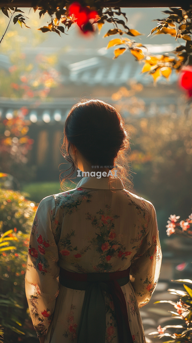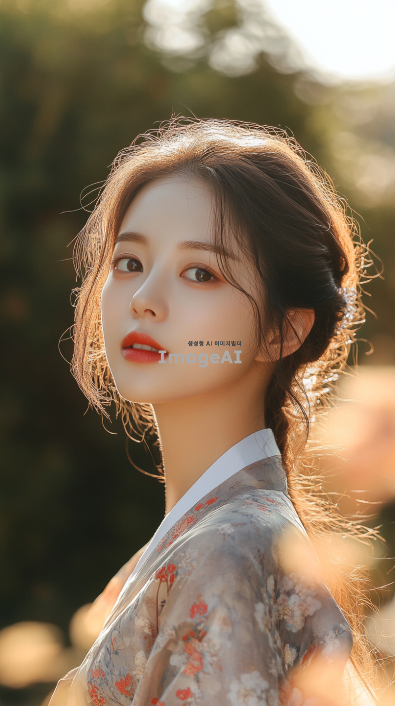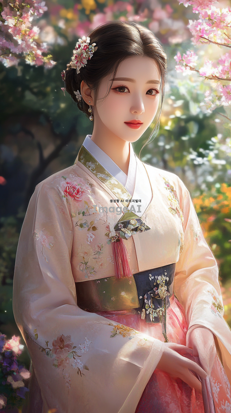한복을 입고 있는 한국 여성의 모습, 전통적인 한복의 화려한 색상과 세련된 디자인, 부드러운 표정과 우아한 자세, 자연광이 비치는 아름다운 정원 배경, 한국의 전통적인 아름다움을 담은 이미지.