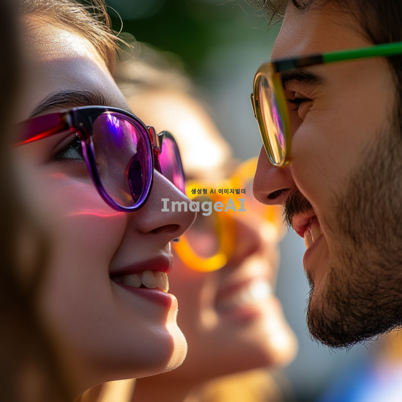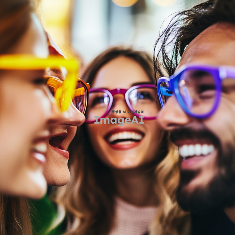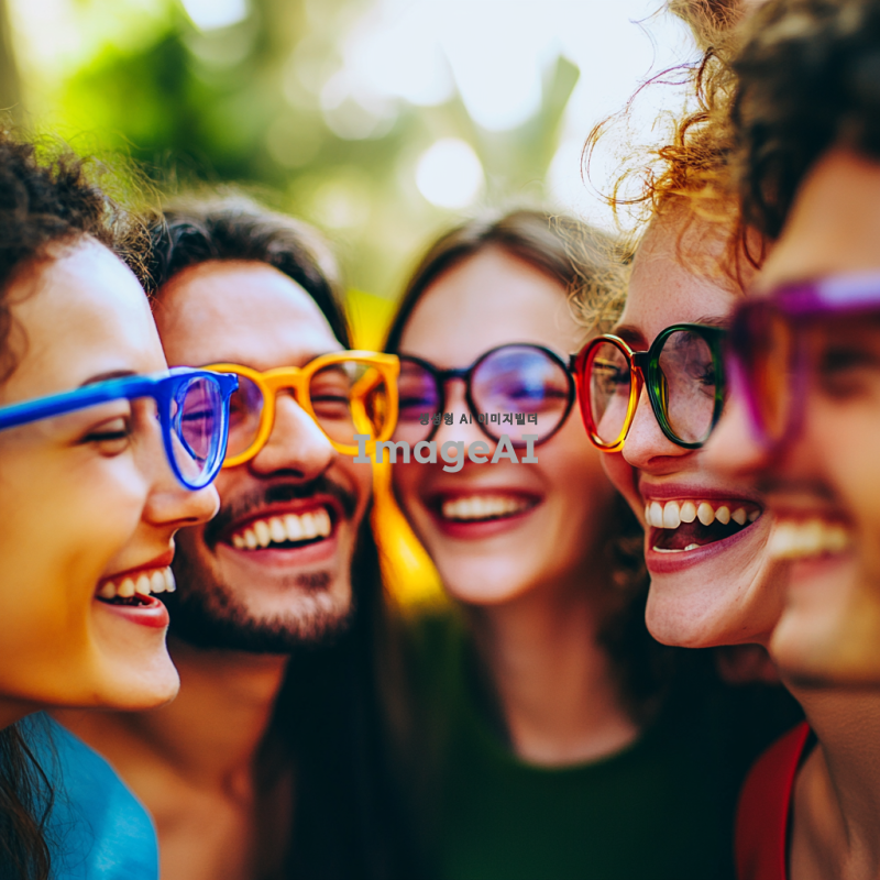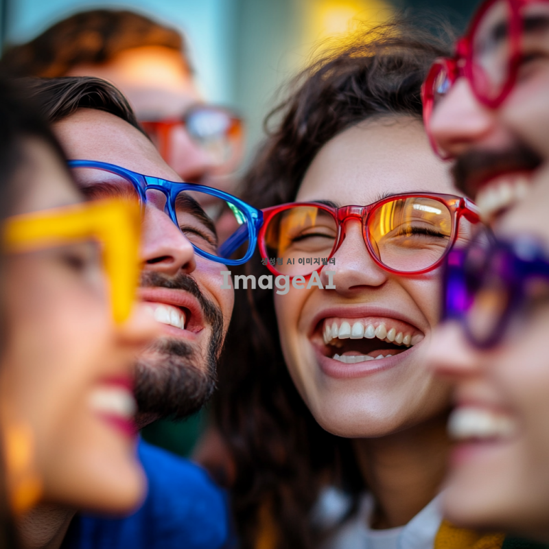 다양한 색상의 안경을 쓴 사람들이 서로를 바라보고 있는 모습. 각 안경은 독특한 색을 띠며, 개인의 편견이나 선입견을 상징함. 배경에는 안경을 벗은 사람들이 함께 어우러져 웃고 있는 장면이 흐릿하게 배치되어, 편견 없이 서로를 존중하고 배려하는 사회의 아름다움을 표현.
