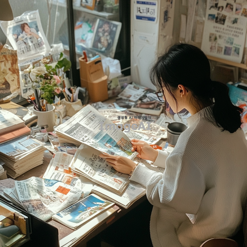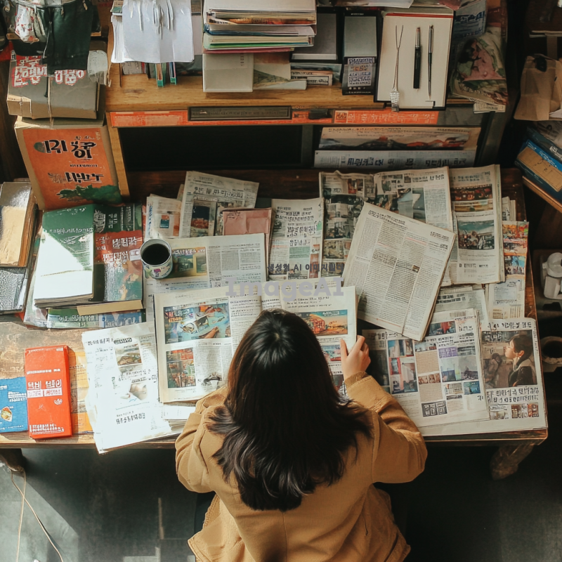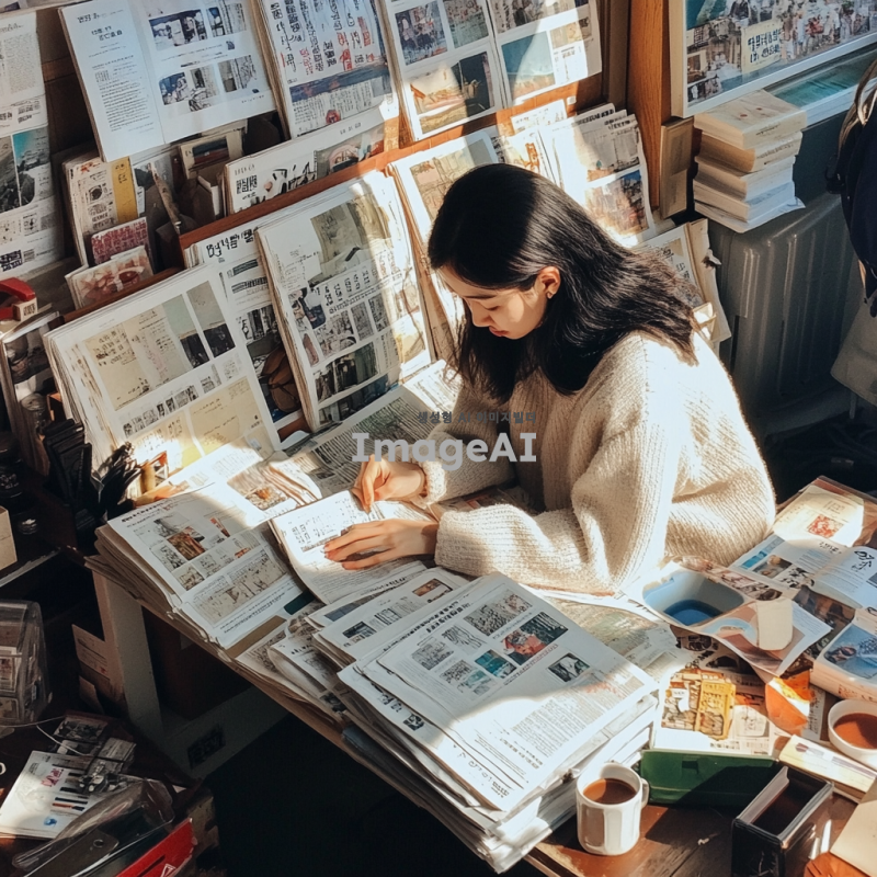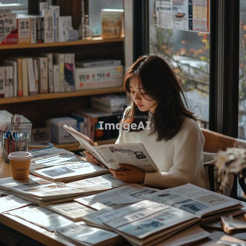 책상 위에 여러 종류의 신문이 펼쳐져 있는 모습, 다양한 색상과 디자인의 신문, 한쪽에는 한국 학생이 앉아 신문을 살펴보고 있는 장면, 학생은 집중한 표정으로 신문을 읽고 있으며, 주변에는 학습 도구와 커피 잔이 놓여 있음, 자연광이 들어오는 아늑한 분위기.