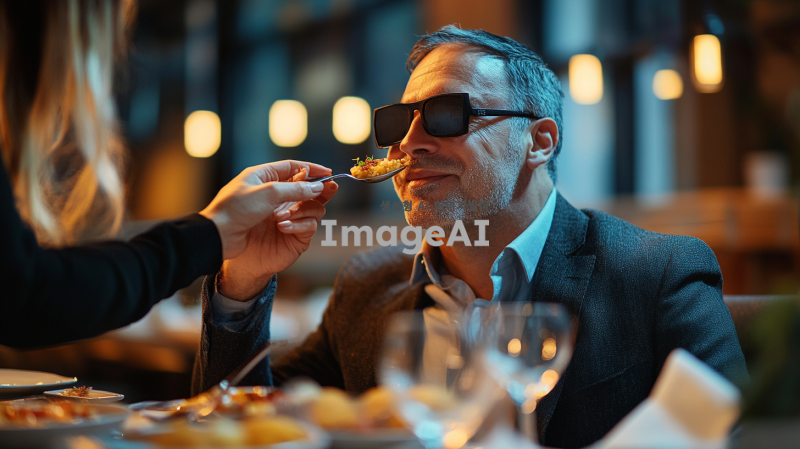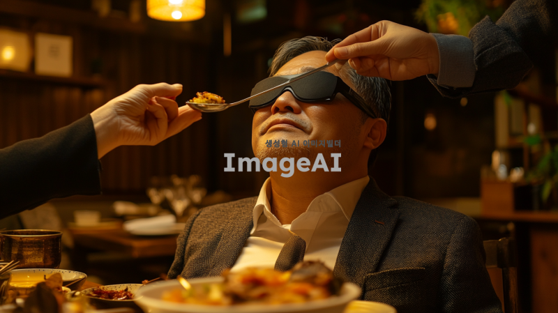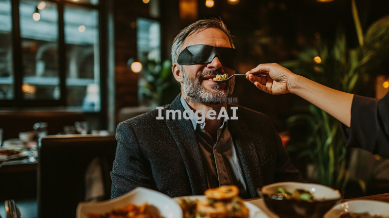 안대를 쓴 정장을 입은 40대 한국 남성이 다른 사람에게 숟가락으로 음식을 받아먹고 있는 모습. 배경은 아늑한 레스토랑 내부로, 조명이 부드럽고 테이블 위에는 다양한 음식들이 놓여있음. 받아먹는 남성의 표정은 기대와 호기심이 섞인 모습이며, 숟가락을 들고 있는 사람은 친근한 미소를 짓고 있음.