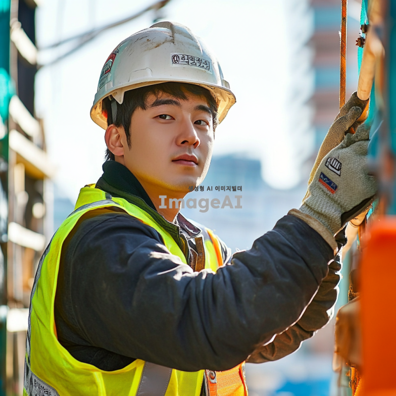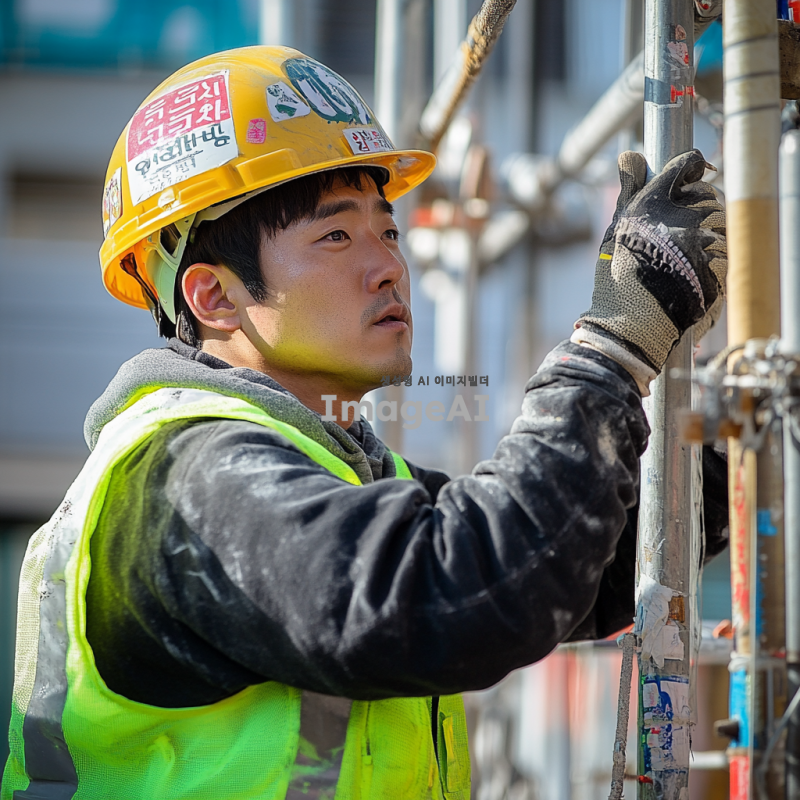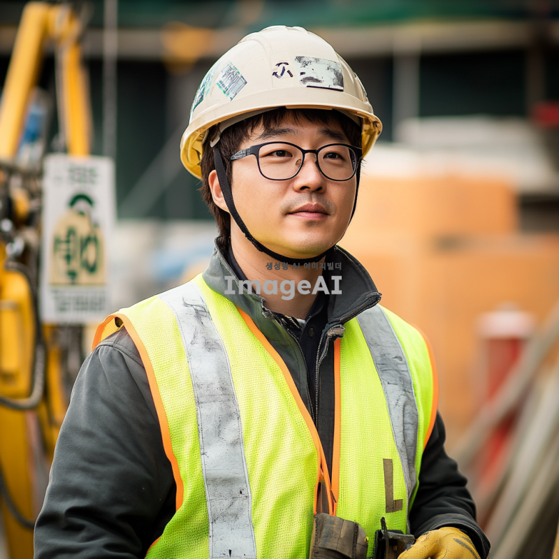 안전 장비를 착용한 한국인 작업자가 공사 현장에서 작업하고 있는 모습. 헬멧, 안전 조끼, 장갑을 착용하고 있으며, 주변에 안전 표지판과 장비가 배치되어 있는 환경. 작업자는 집중한 표정으로 안전하게 작업을 수행하고 있다. 밝고 깨끗한 날씨 속에서 활기찬 분위기를 연출.