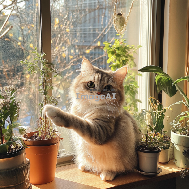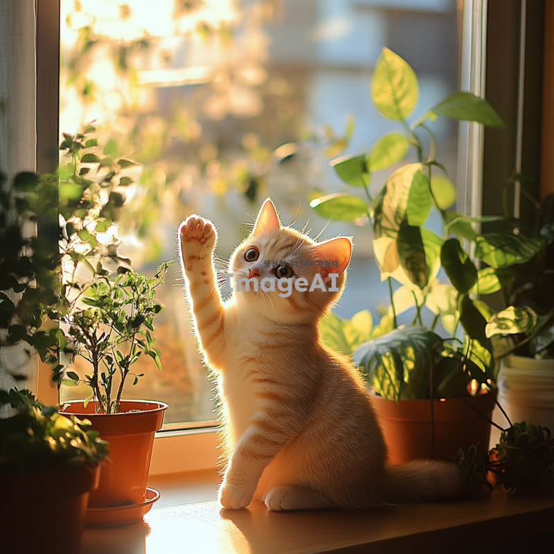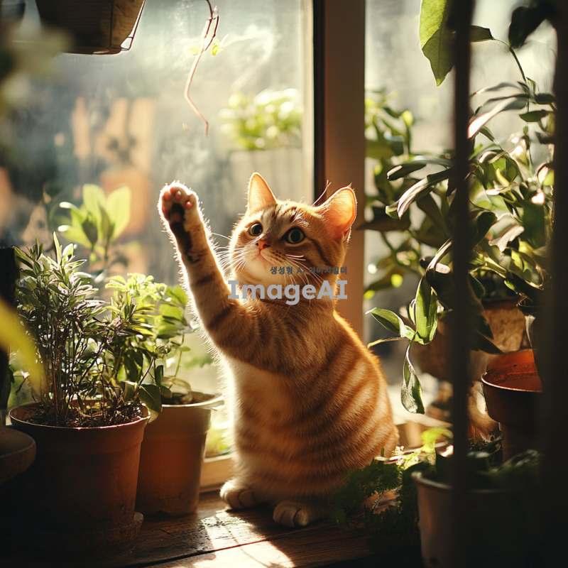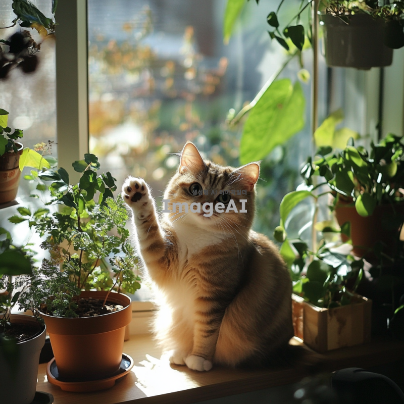 귀여운 한국 고양이가 햇살 가득한 창가에 앉아 있는 모습, 부드러운 털과 큰 눈, 주변에는 화분에 심어진 다양한 식물들이 있어 아늑한 분위기를 자아냄, 고양이가 장난스럽게 손을 흔드는 모습, 따뜻한 색조의 조명 아래에서 평화로운 오후를 즐기는 장면.