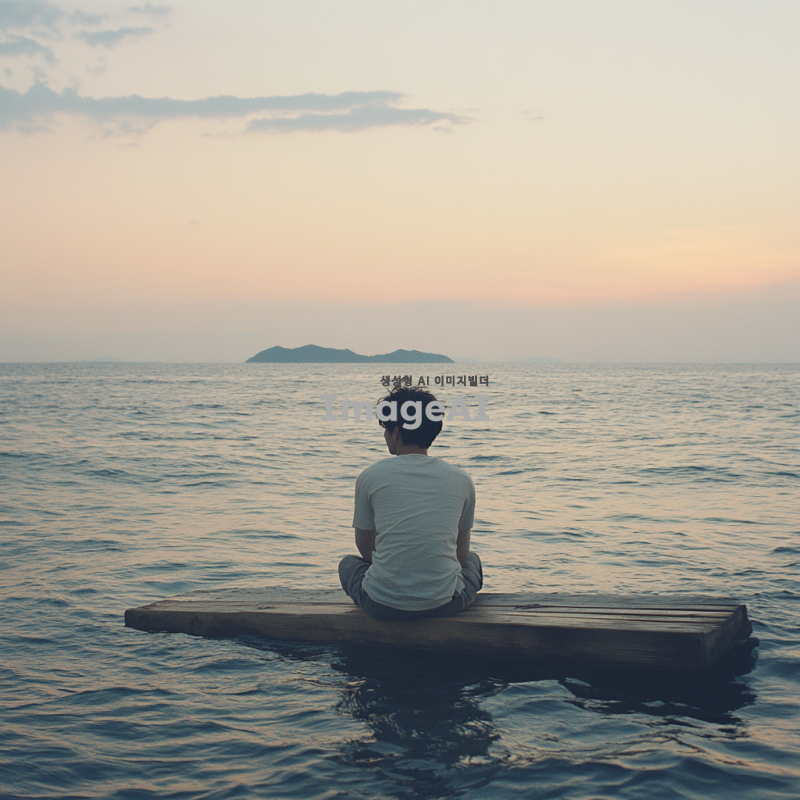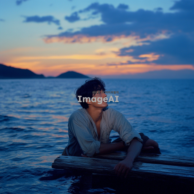 푸른 망망대해에서 나무판자에 의지해 표류하고 있는 한국인 남성, 해가 지고 있는 저녁 하늘, 잔잔한 파도와 함께 고요한 바다, 수평선 너머로 보이는 희미한 섬, 바람에 흩날리는 머리카락, 긴장된 표정, 생존의 의지를 느낄 수 있는 모습, 자연의 아름다움과 위협이 공존하는 장면.