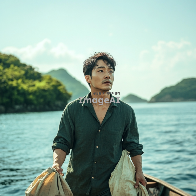 어리둥절한 표정의 한국인 남성이 배에서 내려 무인도로 향하는 장면. 배는 잔잔한 바다에 떠 있고, 무인도는 푸른 나무와 울창한 식물로 가득 차 있다. 하늘은 맑고 해가 비치며, 남성은 간단한 옷차림으로 손에 작은 가방을 들고 있다. 배경에는 멀리 보이는 다른 섬들이 흐릿하게 나타나고, 바다의 파도는 부드럽게 일렁이고 있다.