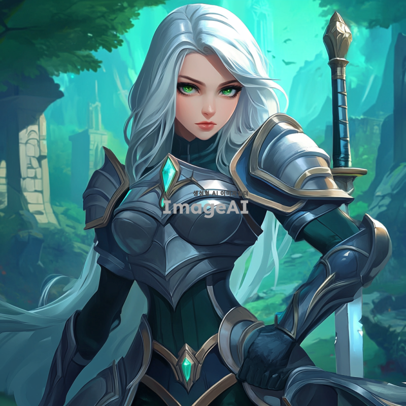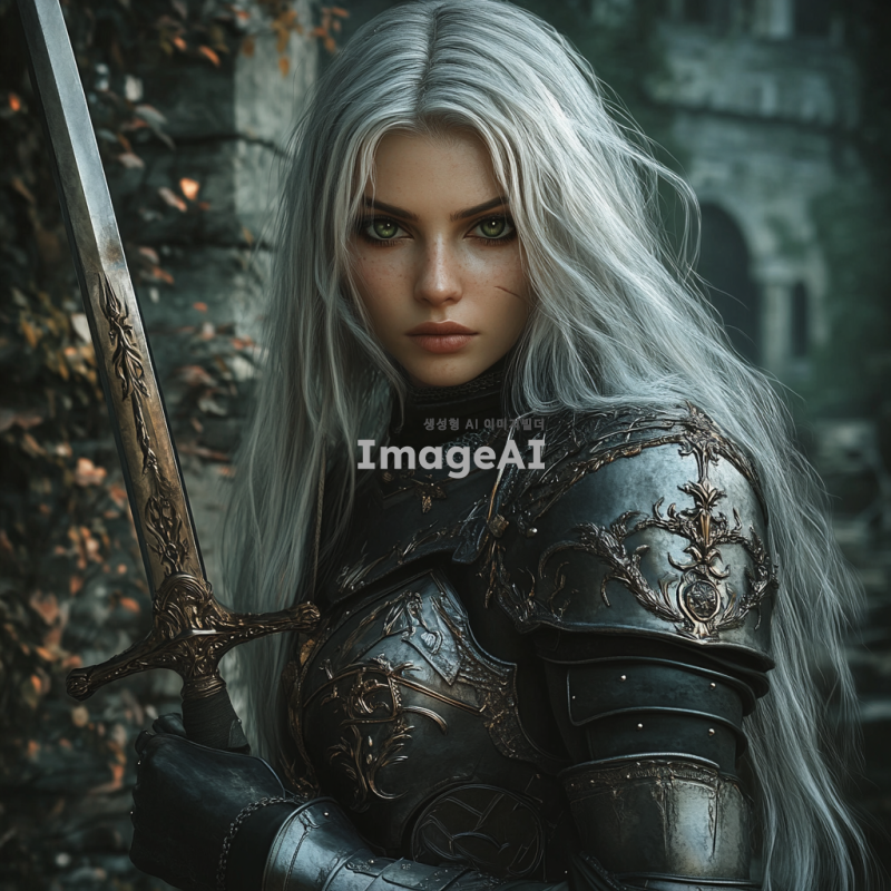 강인한 여성 전사, 긴 은발과 녹색 눈을 가진 캐릭터. 중세 스타일의 갑옷을 입고 있으며, 손에는 마법적인 힘을 상징하는 검을 들고 있다. 배경은 신비로운 숲과 고대의 유적이 어우러진 풍경으로, 신비로운 분위기가 감돌고 있다. 그녀의 표정은 결단력 있고 자신감 넘치며, 주변에는 마법의 기운이 감지된다.