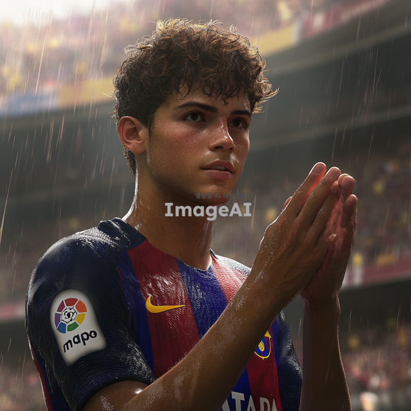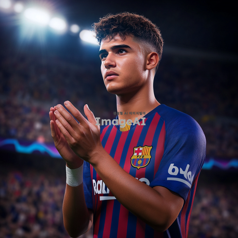 19세의 브라질 축구 선수, 바르셀로나 유니폼을 입고 경기 후 박수를 치는 모습, 짧은 머리 스타일, 남성, 한 사람, 고화질, 하이퍼 디테일, 아름답게 색상 조정된, 놀라운 세부 묘사, 복잡한 디테일, 아름답게 색 보정된, 실제 사진 같은 리얼리즘, 세밀한 머리카락 질감.