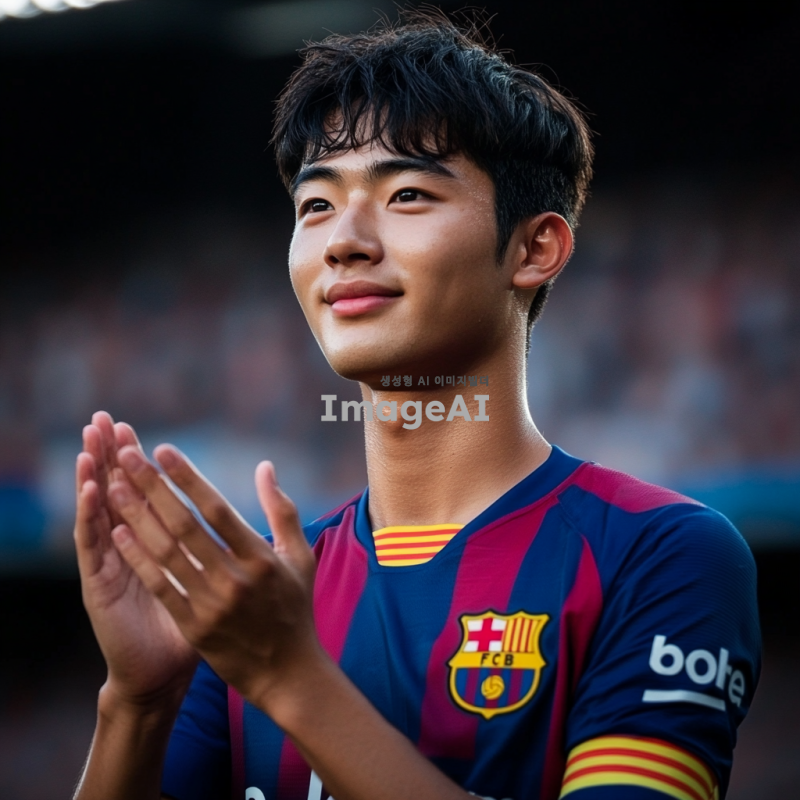 19세 한국 남자 축구 선수, 바르셀로나 유니폼을 입고 경기 후 박수를 치고 있는 모습, 짧은 머리 스타일, 한 사람, 고화질, 하이퍼 디테일, 아름답게 색상 조정된, 놀라운 디테일, 복잡한 세부 묘사, 아름답게 색 보정된, 사실적인 사진, 사실주의, 세밀한 머리 텍스처