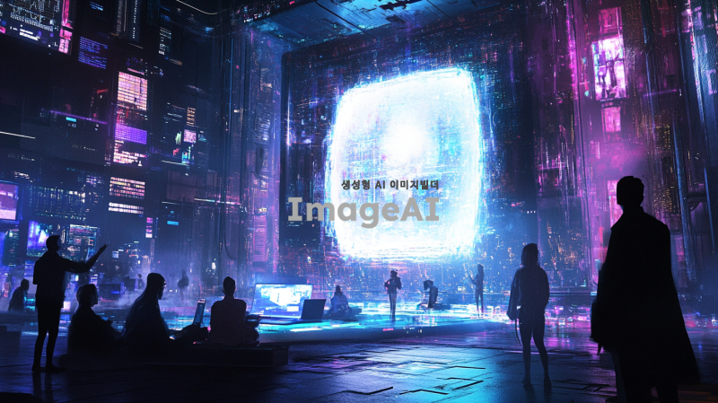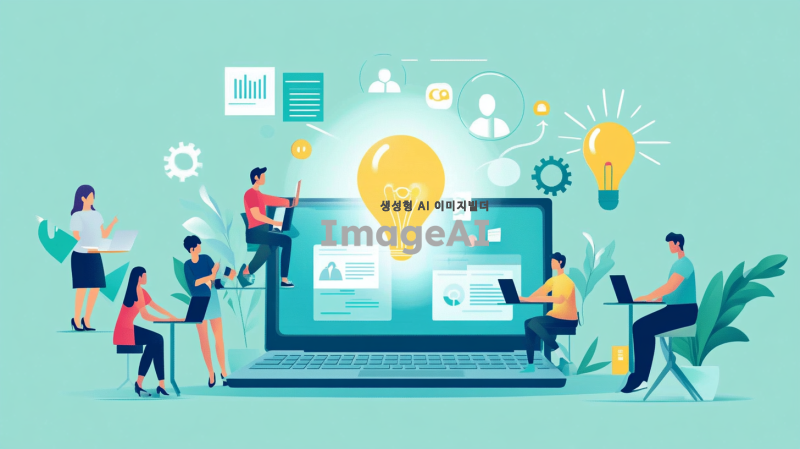 거대한 노트북 위에 여러 사람이 일하는 모습, 노트북 화면에서 나오는 빛으로 형성된 홀로그램이 주변에 떠있는 장면. 다양한 직업을 가진 사람들이 협업하며 아이디어를 나누는 모습, 현대적인 사무실 환경, 생동감 있는 색감과 디테일이 강조된 이미지.