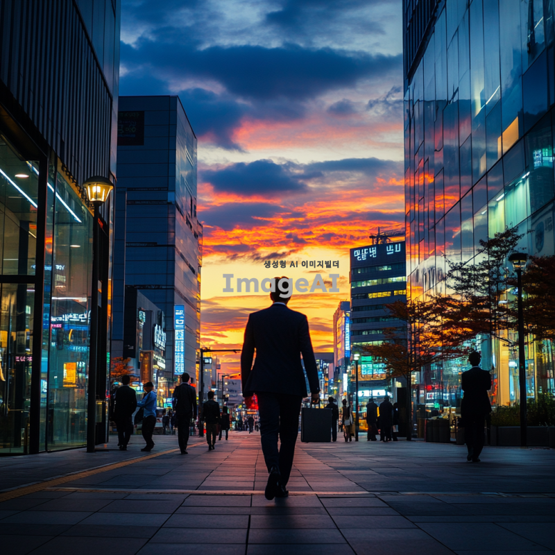저녁 노을이 지는 도시의 거리에서 퇴근하는 한국인 직장인의 모습. 정장 차림의 남성이 손에 서류 가방을 들고 걷고 있으며, 주변에는 현대적인 건물과 가로등이 켜져 있는 모습. 길가에는 사람들이 오가는 모습이 보이고, 배경에는 푸른 하늘과 함께 붉은 노을이 물들어 있는 풍경.