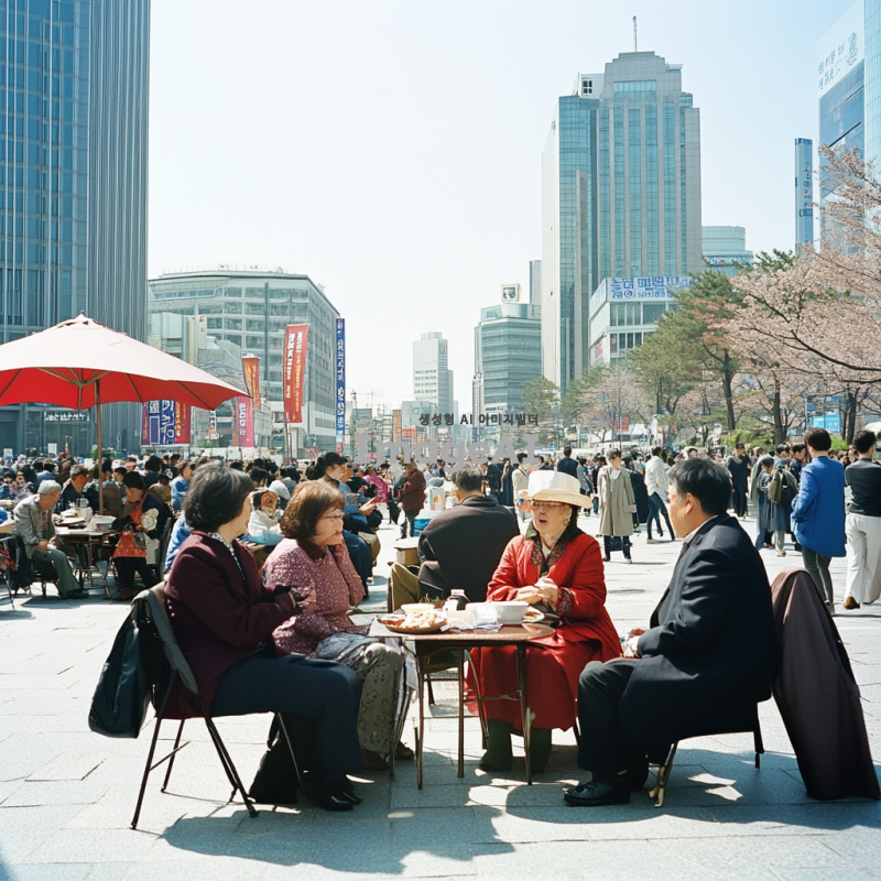 광화문 광장에서의 활기찬 일상 풍경, 다양한 연령대의 한국인들이 모여 있는 모습, 역사적인 건축물과 현대적 요소가 조화를 이루는 장면, 화창한 날씨 아래 사람들의 웃음과 대화가 넘치는 분위기, 전통과 현대가 어우러진 문화 행사 또는 거리 공연이 진행되고 있는 모습.